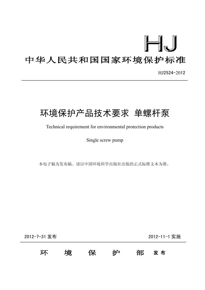 HJ 2524-2012 环境保护产品技术要求 单螺杆泵
