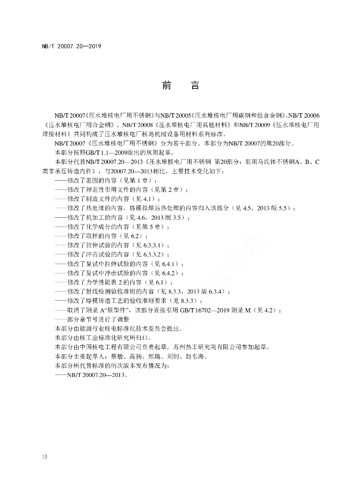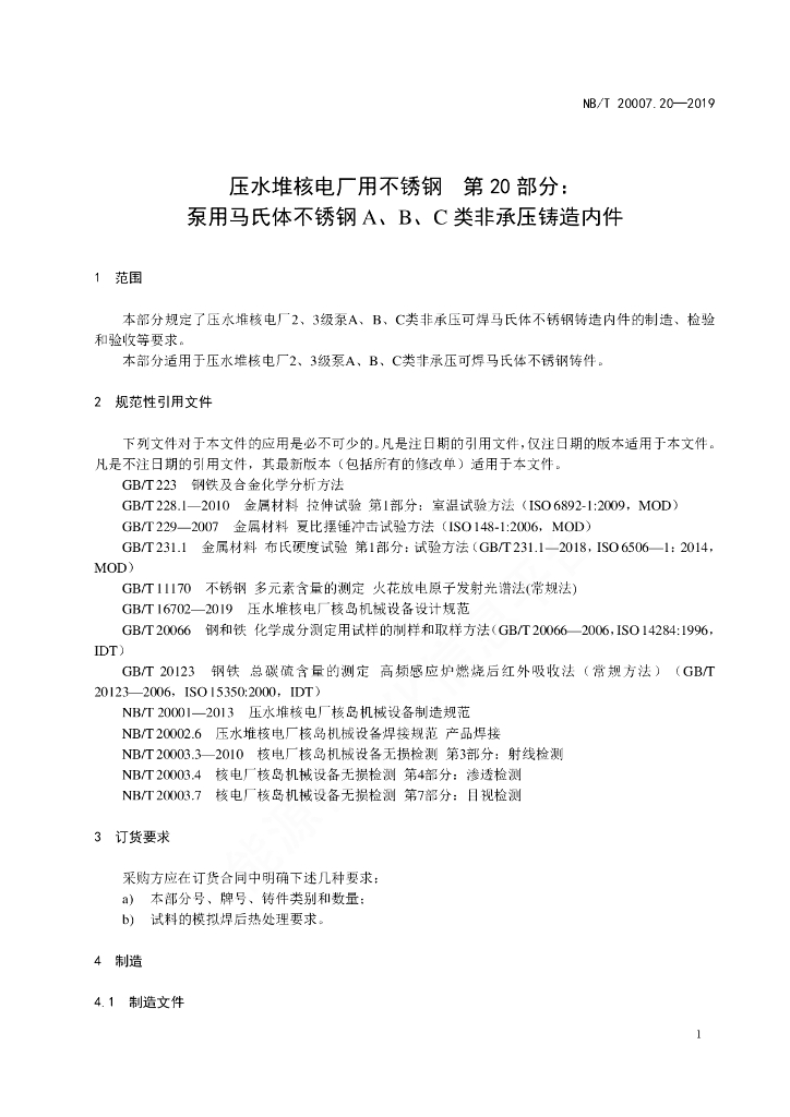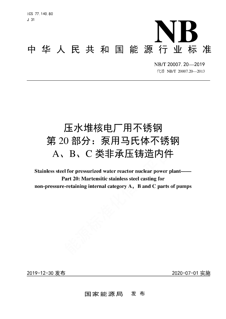 NB/T 20007.20-2019 压水堆核电厂用不锈钢 第20部分:泵用马氏体不锈钢A、B、C类非承压铸造内件