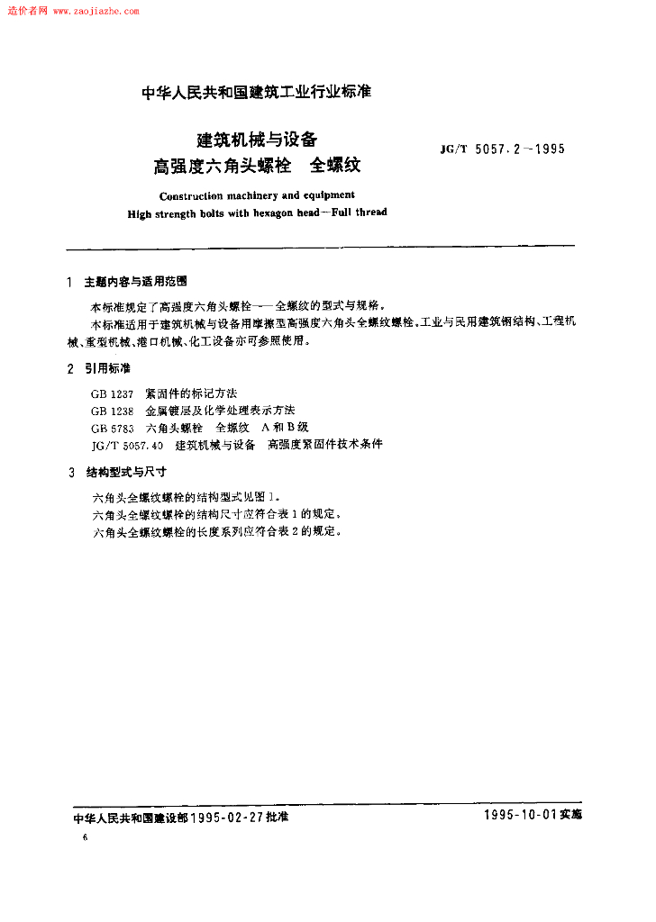 JG/T 5057.2-1995 建筑机械与设备高强度六角头螺栓 全螺纹规范