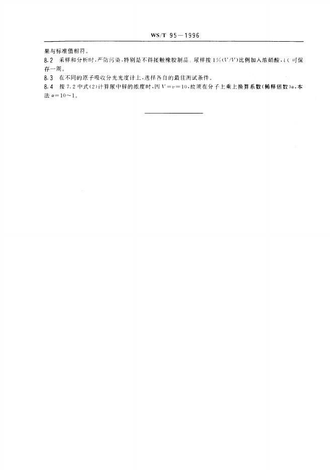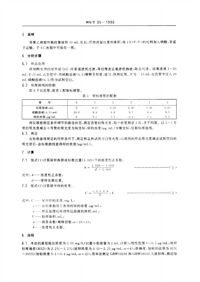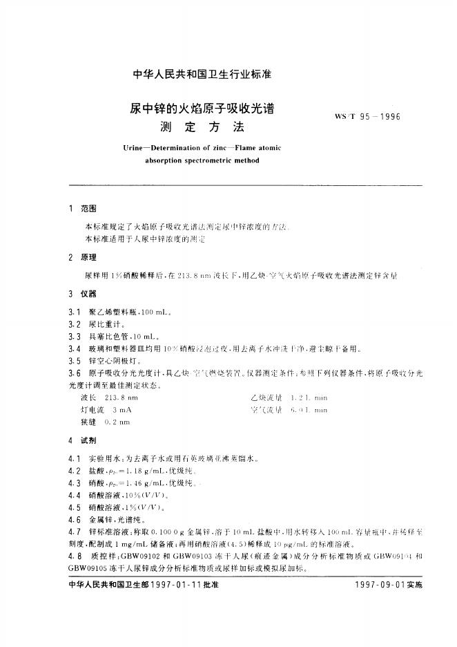 WS/T 95-1996 尿中锌的火焰原子吸收光谱测定方法