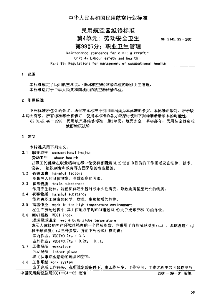 MH 3145.99-2001 民用航空器维修标准 第4单元 劳动安全卫生 第99部分 职业卫生管理