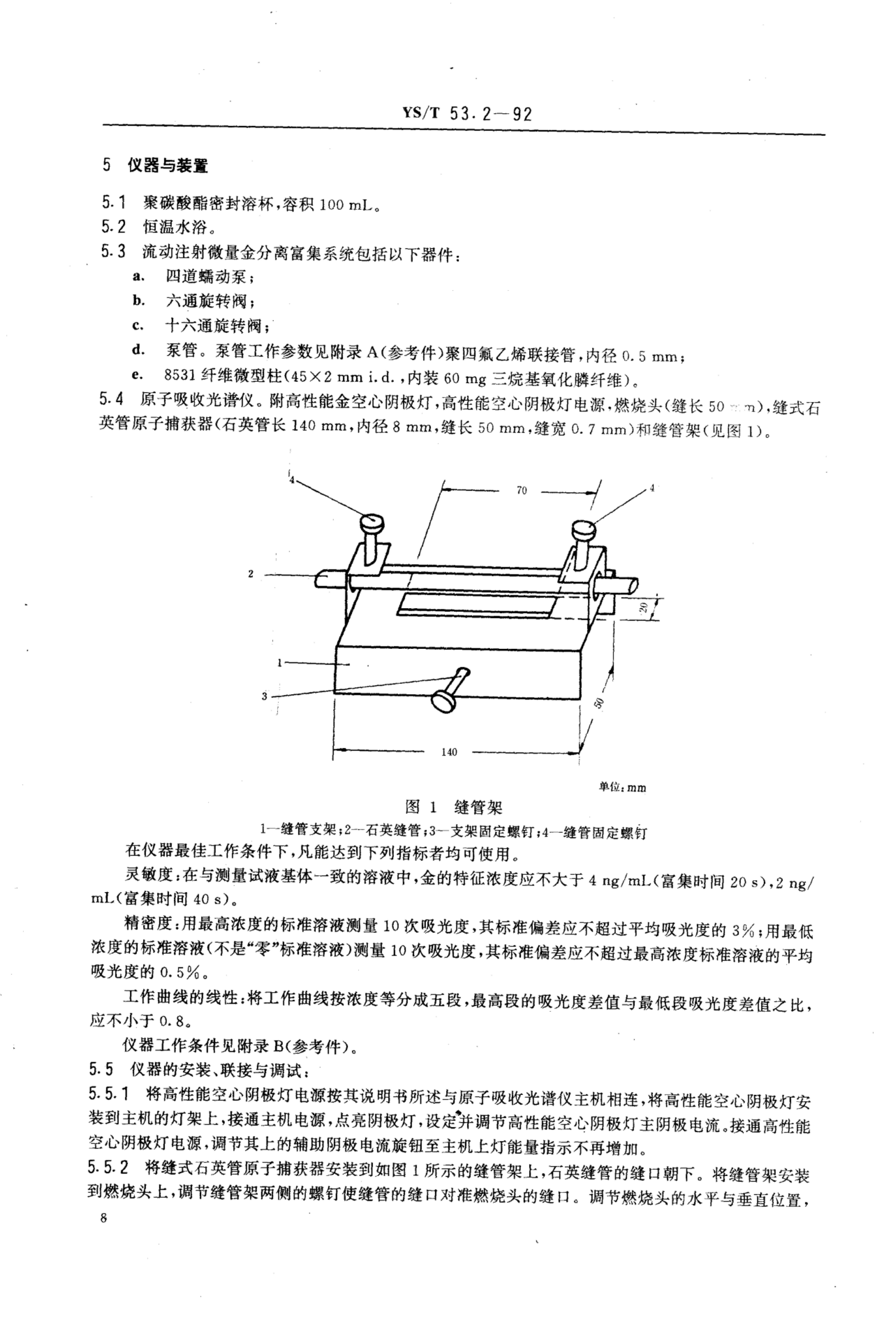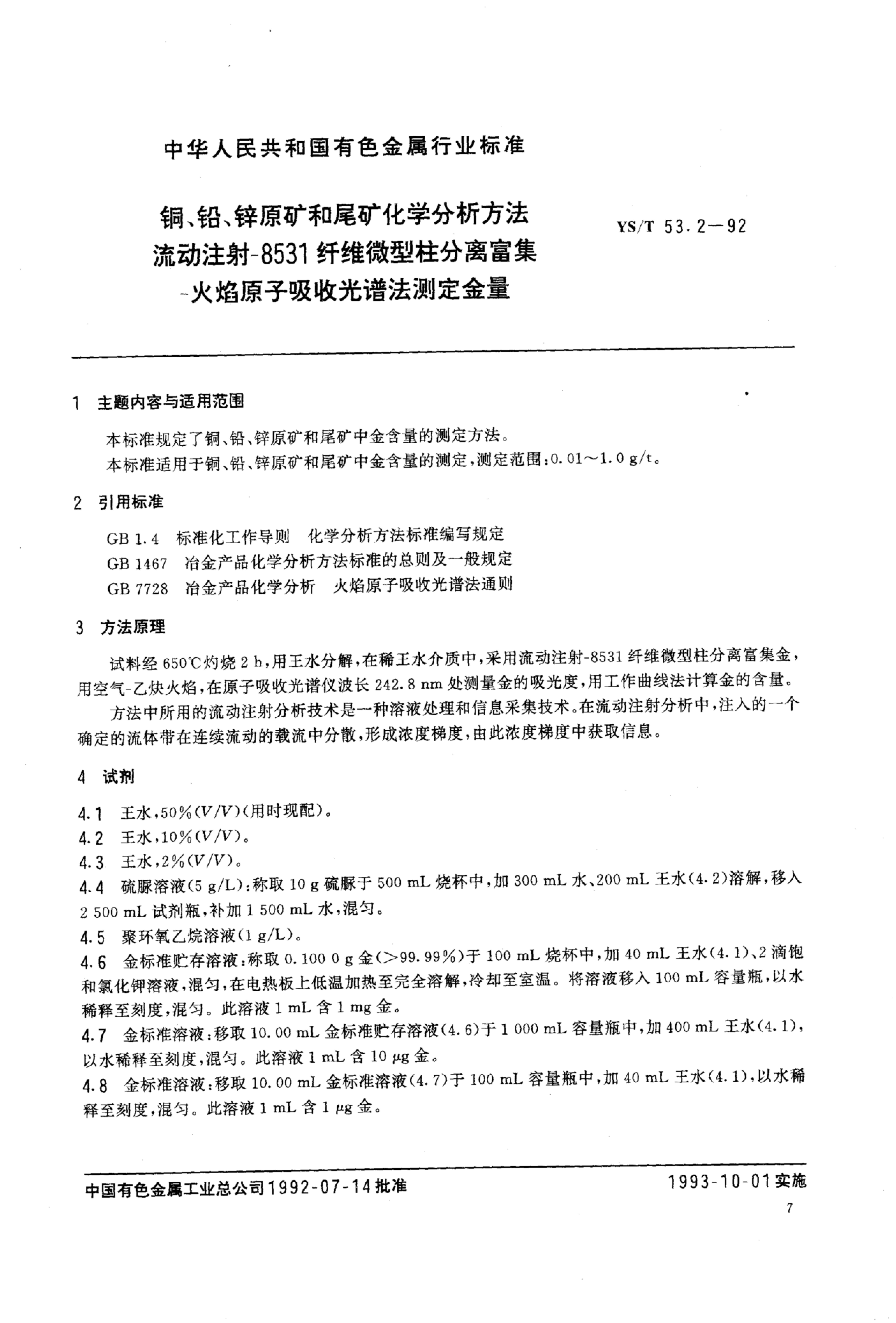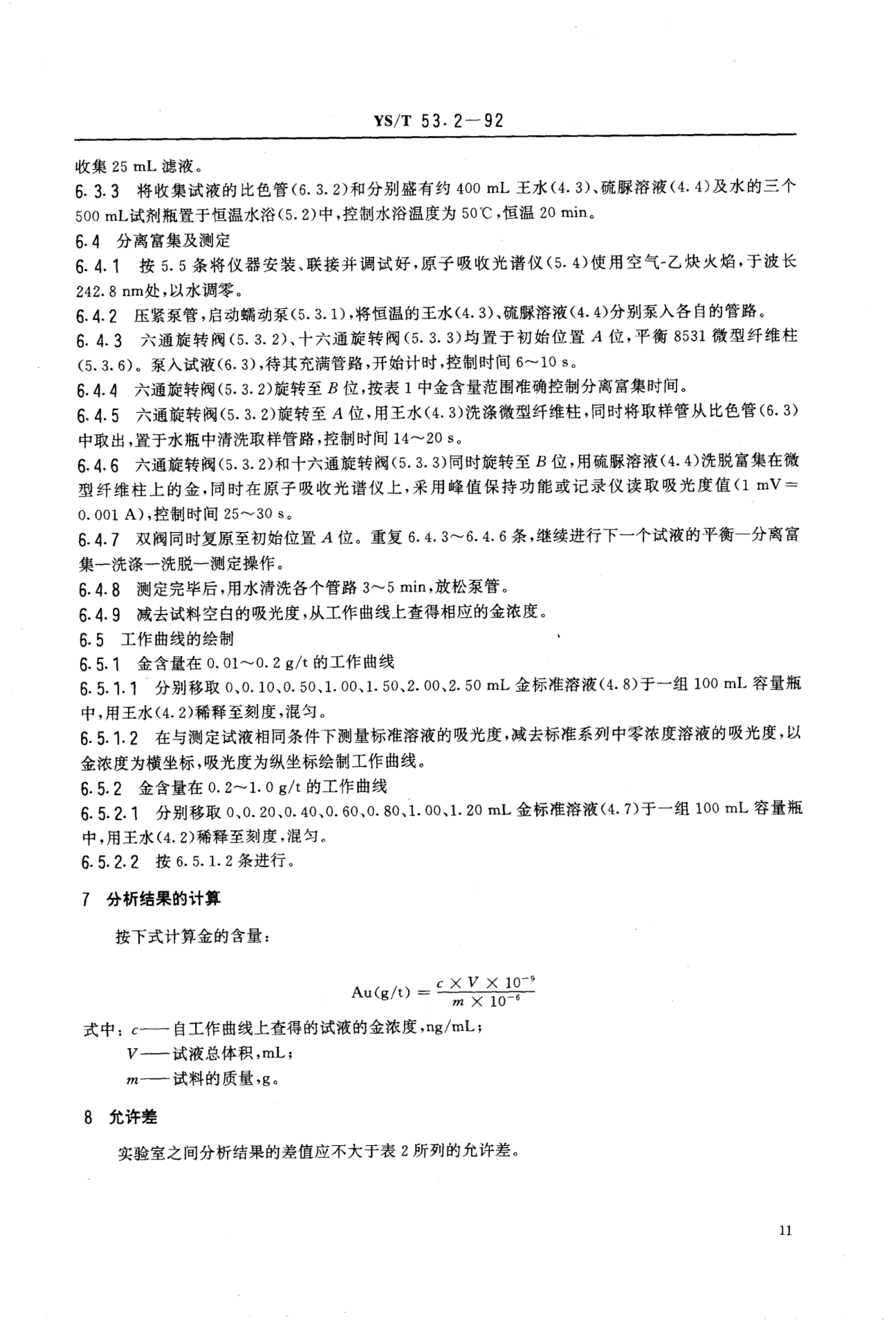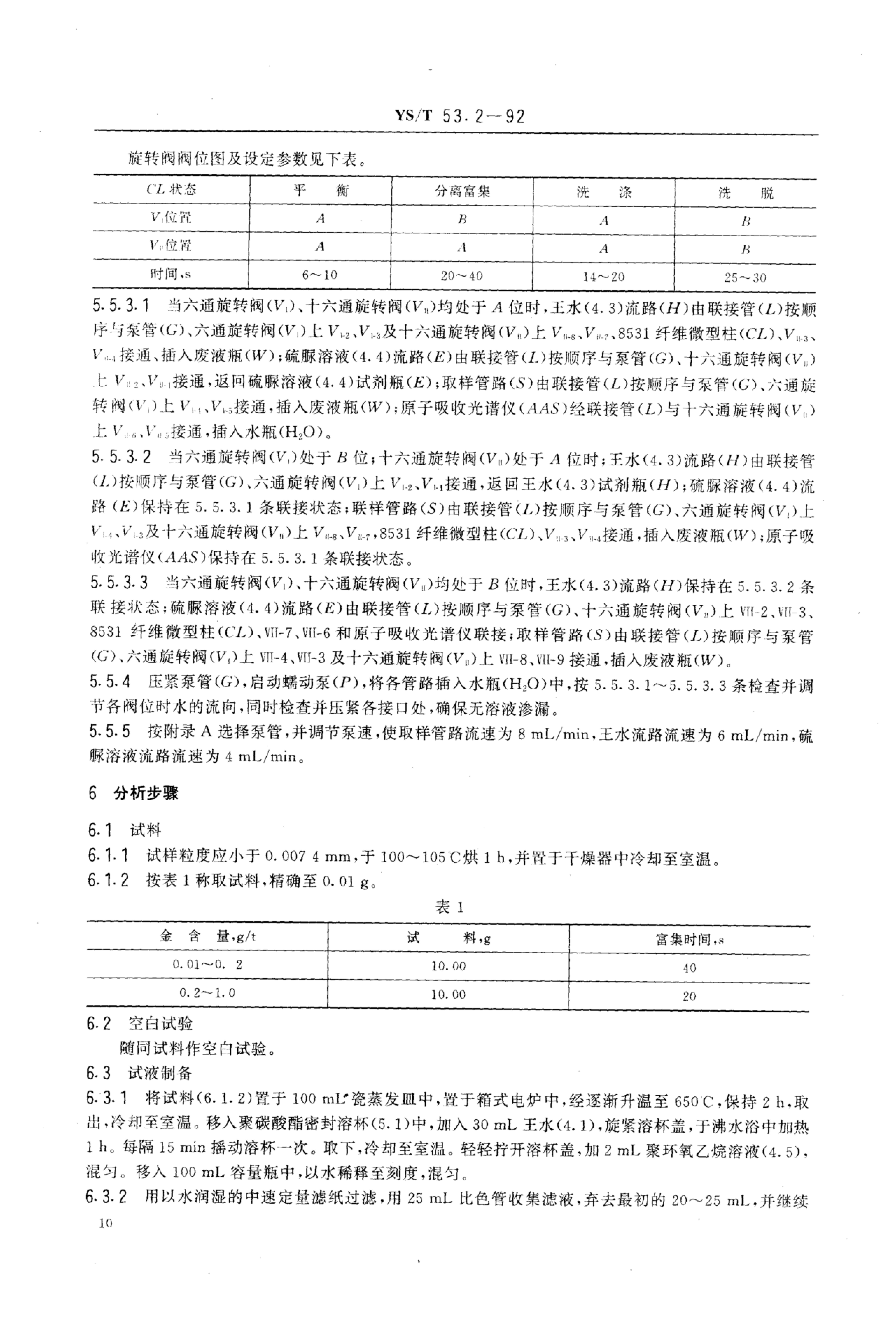 YS/T 53.2-1992 铜,铅,锌原矿和尾矿化学分析方法流动注射-8531纤维型柱分离富集-火焰原子吸收光谱法测定金量