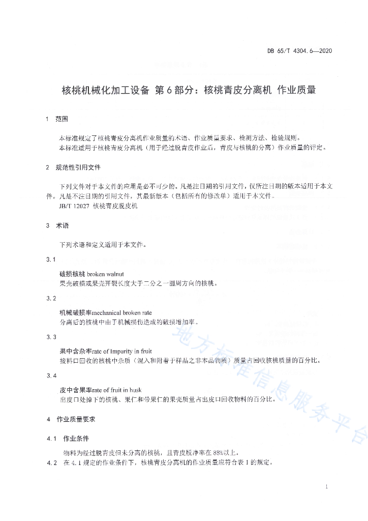 DB65/T 4304.6-2020 核桃机械化加工设备 第6部分:核桃青皮分离机 作业质量