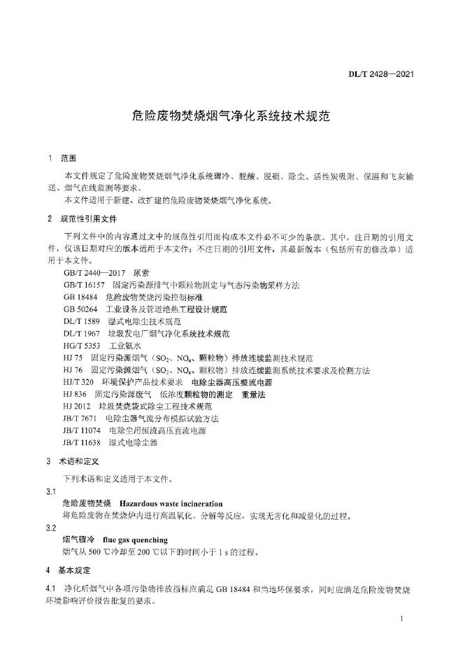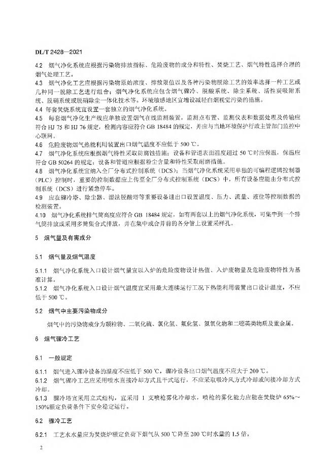 DL/T 2428-2021 危险废物焚烧烟气净化系统技术规范