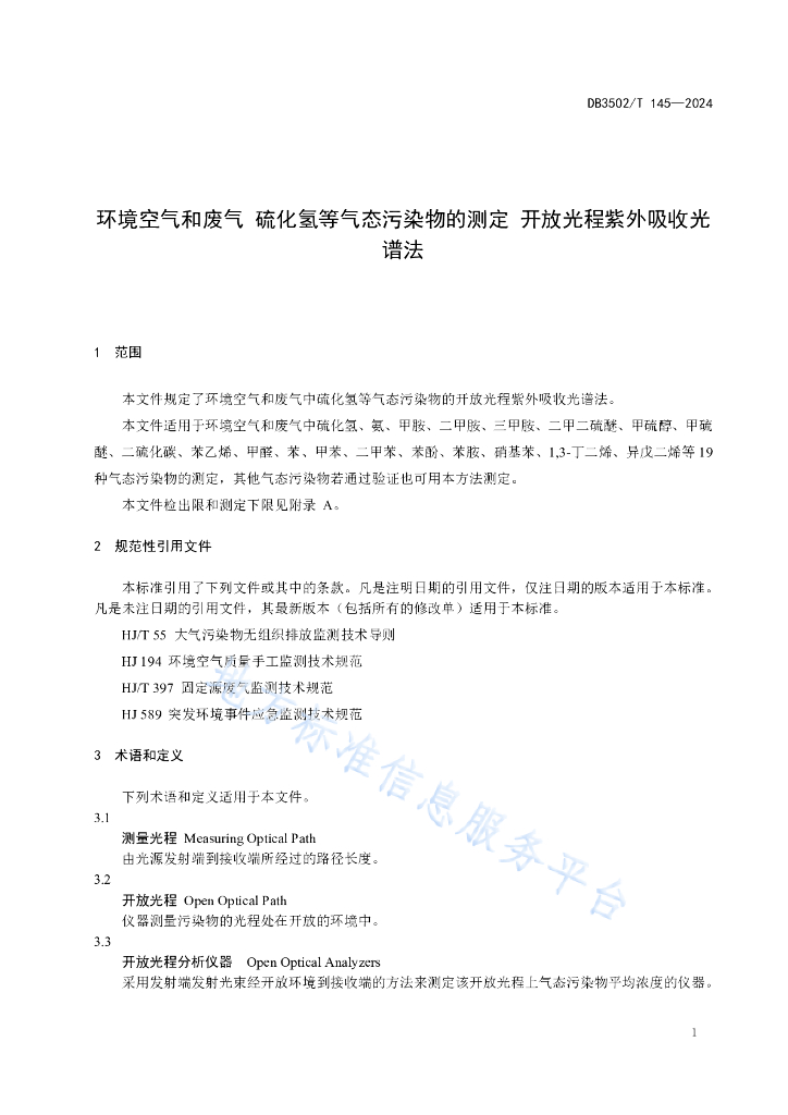 DB3502/T 145-2024 环境空气和废气 硫化氢等气态污染物的测定 开放光程紫外吸收光谱法