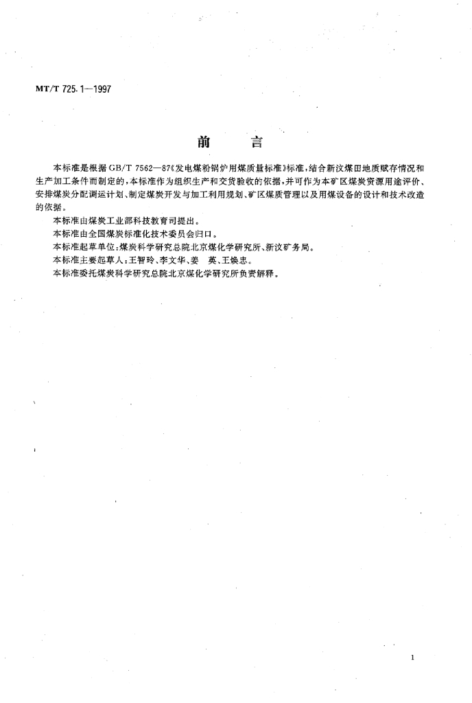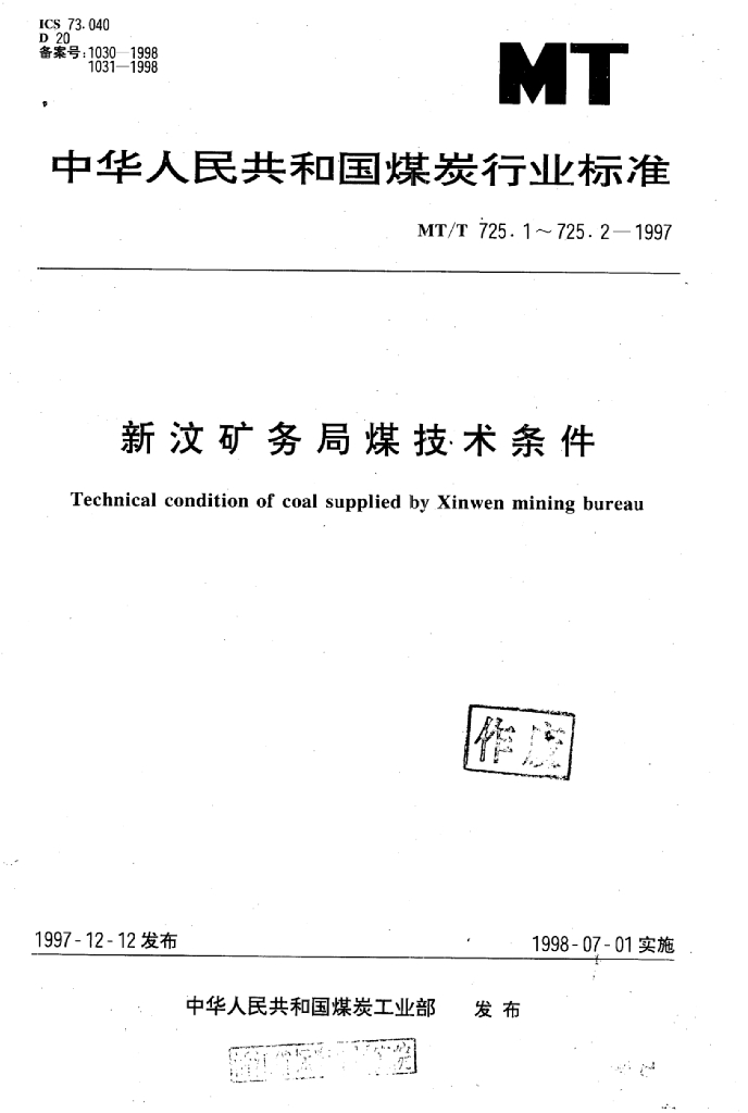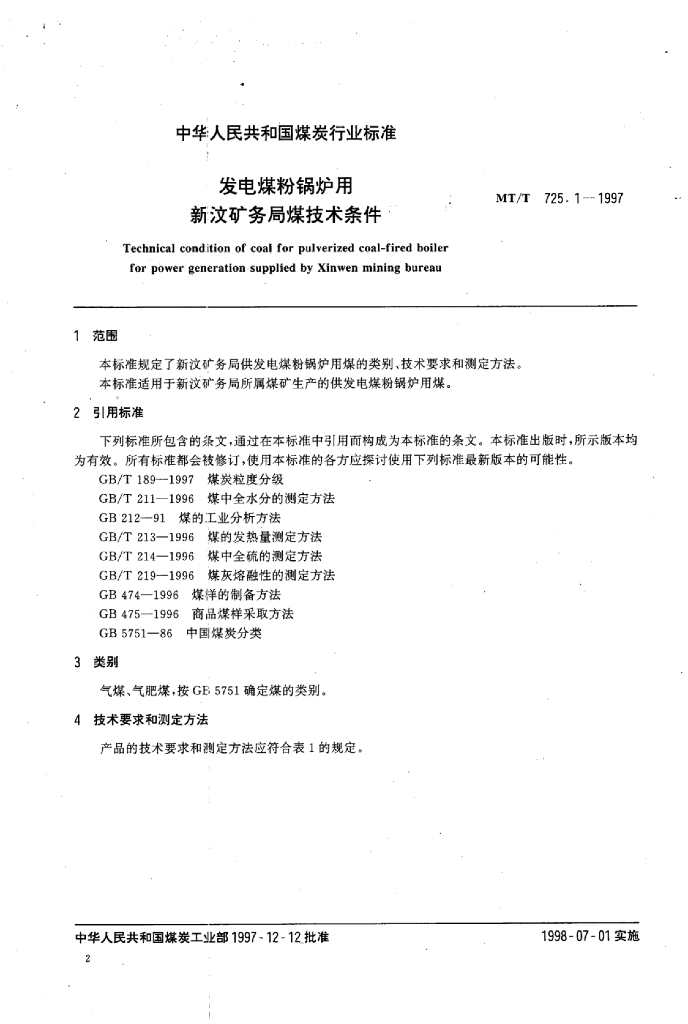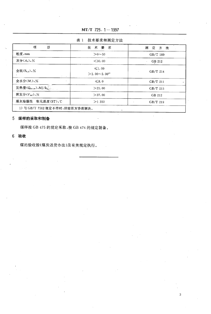 MT/T 725.1-1997 发电煤粉锅炉用新汶矿务局煤技术条件
