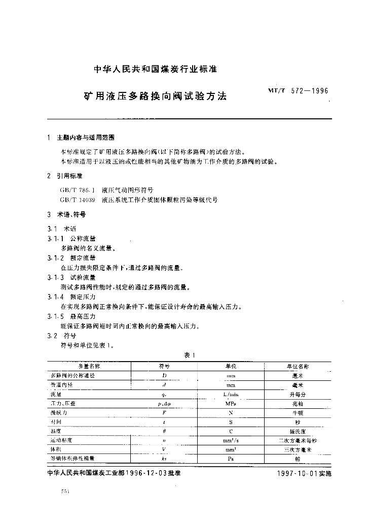 MT/T 572-1996 矿用液压多路换向阀试验方法