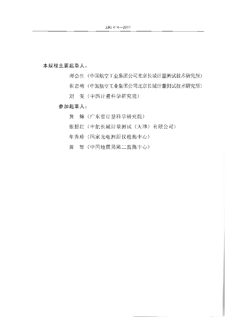师会生(中国航空工业集团公司北京长城计量测试技术研究所)、崔岩梅(中国航空工业集团公司北京长城计量测试技术研究所)、刘雯(中国计量科学研究院)、黄稣(广东省计量科学研究院)、张振红(中航长城计量测试(天津)有限公司)、牟秀珍(国家光电测距仪检测中心)、黄智(中国地震局第二监测中心)