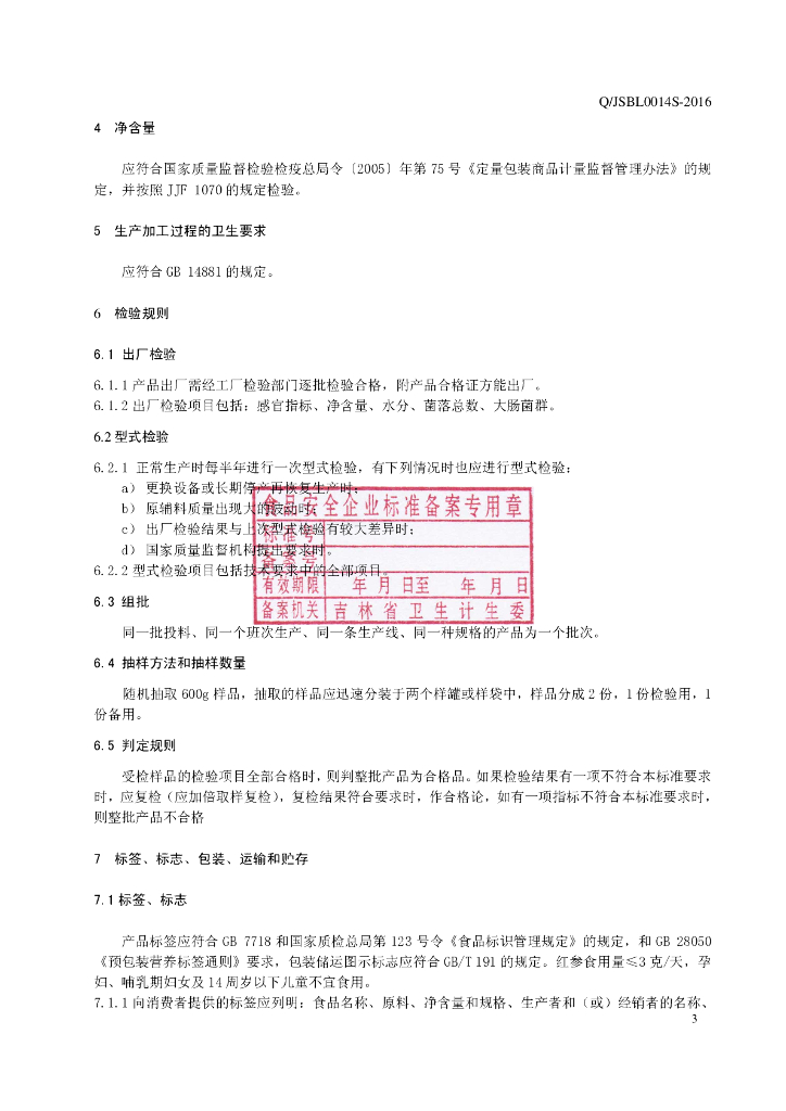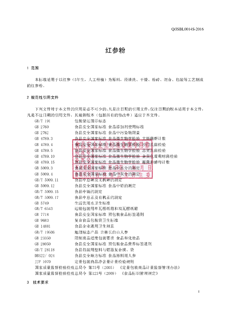 Q/JSBL 0014S-2016 吉林省申博莱雅生物科技有限公司 红参粉