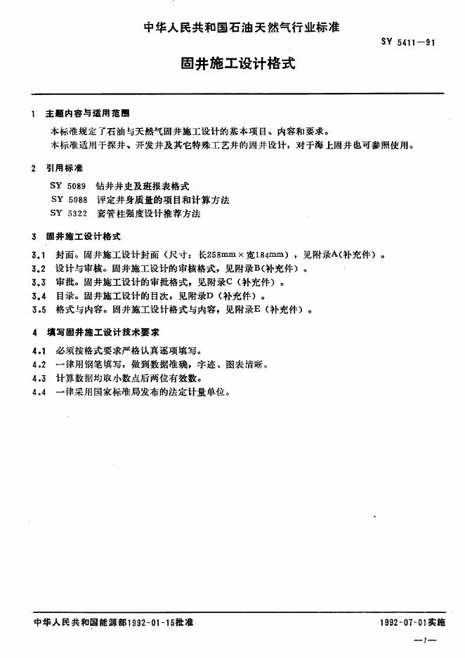 SY 5411-1991 固井施工设计格式