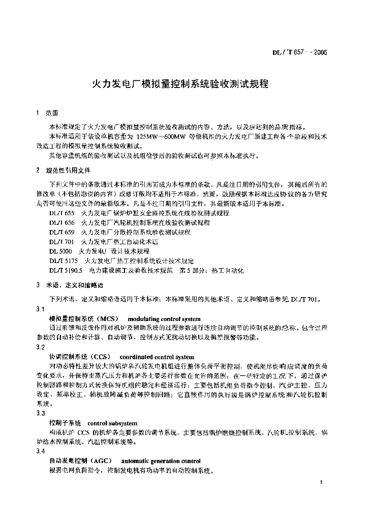 DL/T 657-2006 火力发电厂模拟量控制系统验收测试规程