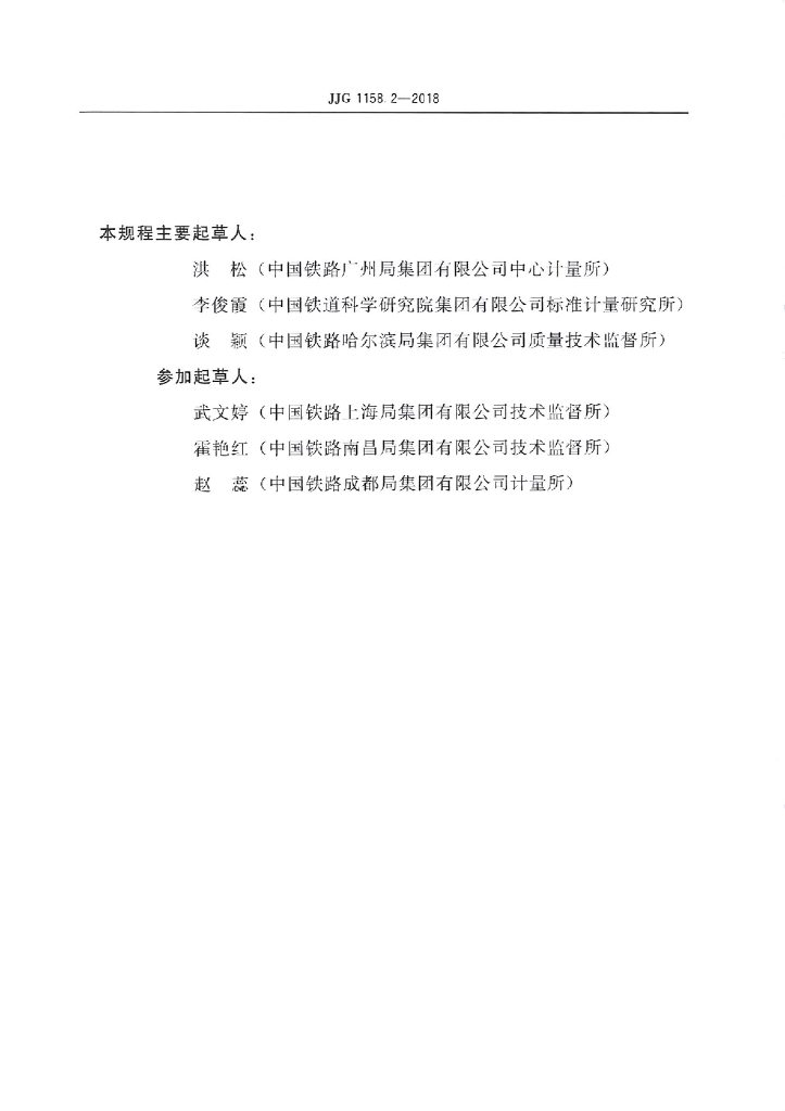 洪松(中国铁路广州局集团有限公司中心计量所)、李俊霞(中国铁道科学研究院集团有限公司标准计量研究所)、谈颖(中国铁路哈尔滨局集团有限公司质量技术监督所)、武文婷(中国铁路上海局集团有限公司技术监督所)、霍艳红(中国铁路南昌局集团有限公司技术监督所)、赵蕊(中国铁路成都局集团有限公司计量所)
