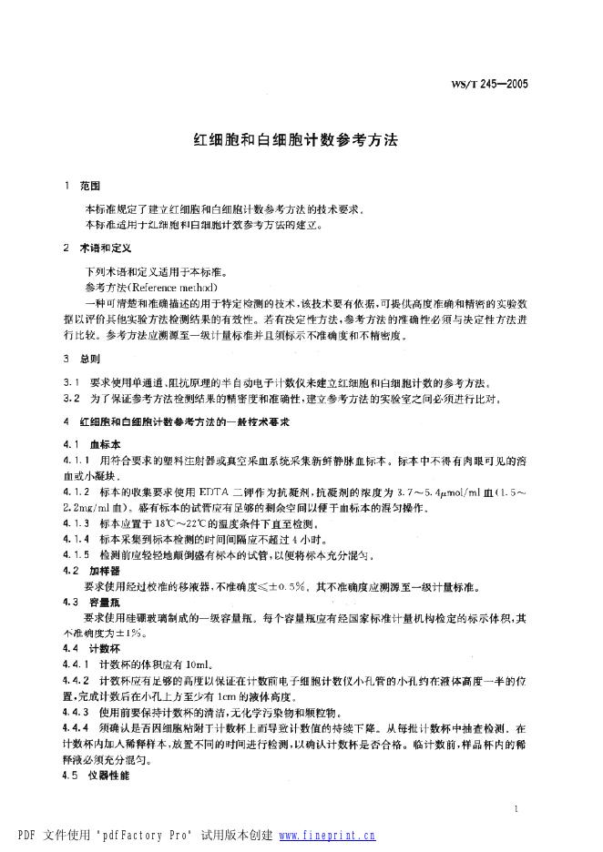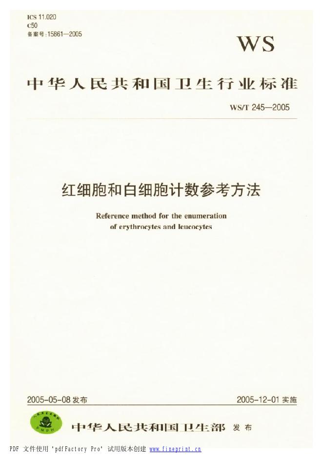 WS/T 245-2005 红细胞和白细胞计数参考方法