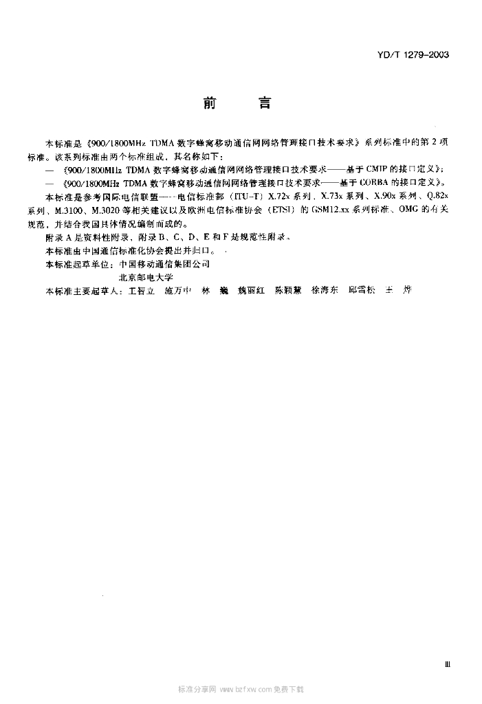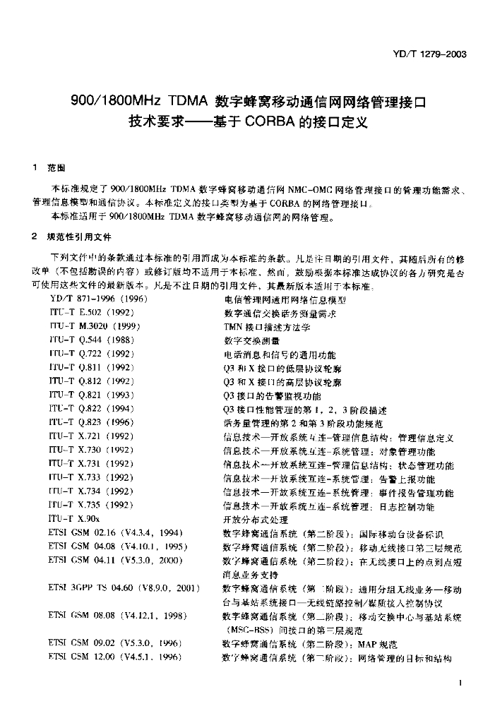 YD/T 1279-2003 900/1800MHz TDMA 数字蜂窝移动通信网网络管理接口技术要求——基于 CORBA 的接口定义