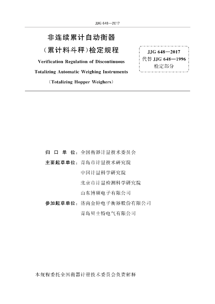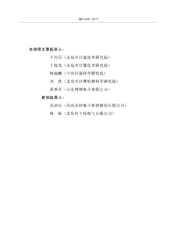 王均国(青岛市计量技术研究院)、于旭光(青岛市计量技术研究院)、钟瑞麟(中国计量科学研究院)、刘伟(北京市计量检测科学研究院)、黄香亭(山东博硕电子有限公司)、范韶辰(济南金钟电子衡器股份有限公司)、林栋(青岛贝士特电气有限公司)
