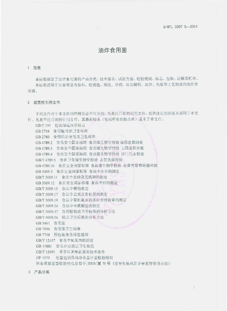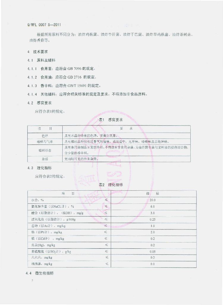 Q/WFL 0007S-2011 油炸食用菌