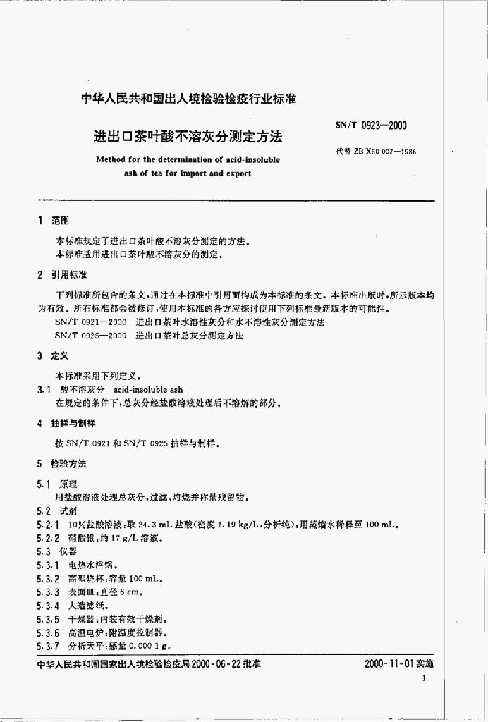 SN/T 0923-2000 进出口茶叶酸不溶灰分测定方法