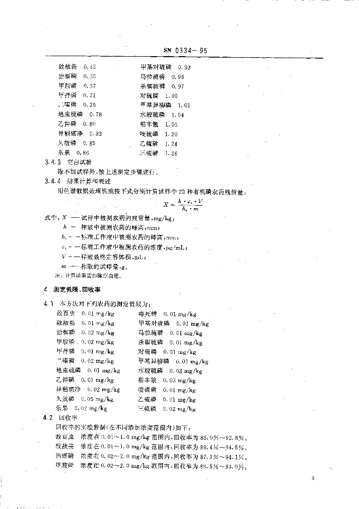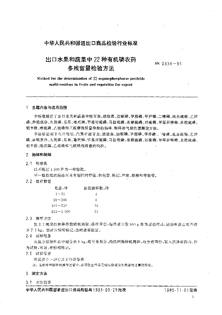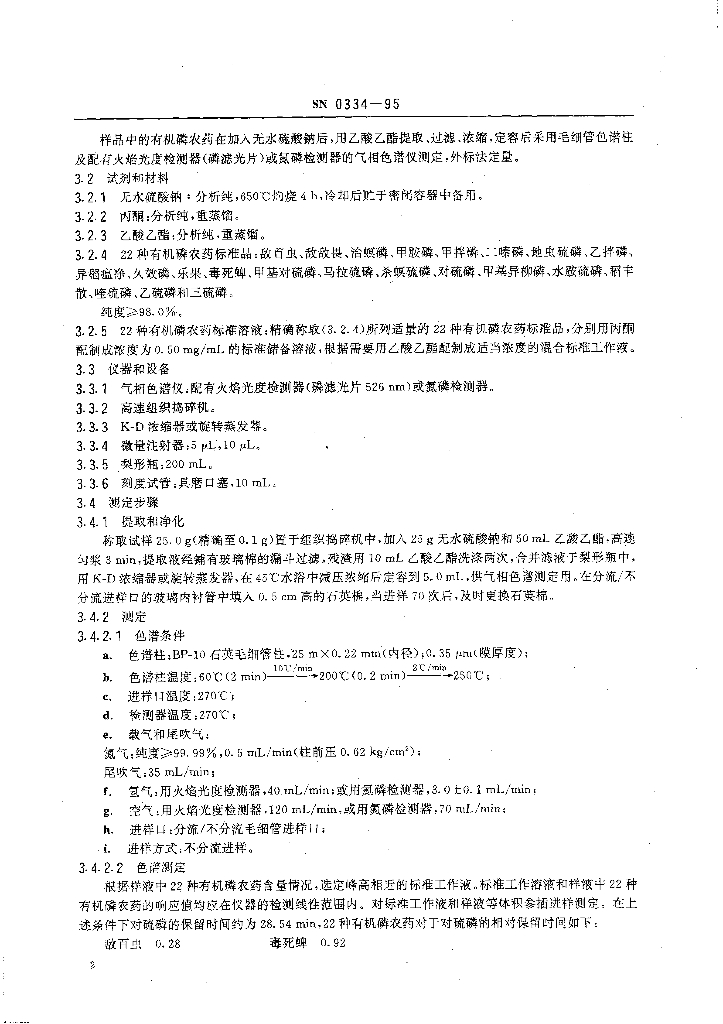 SN 0334-1995 出口水果和蔬菜中22种有机磷农药多残留量检验方法