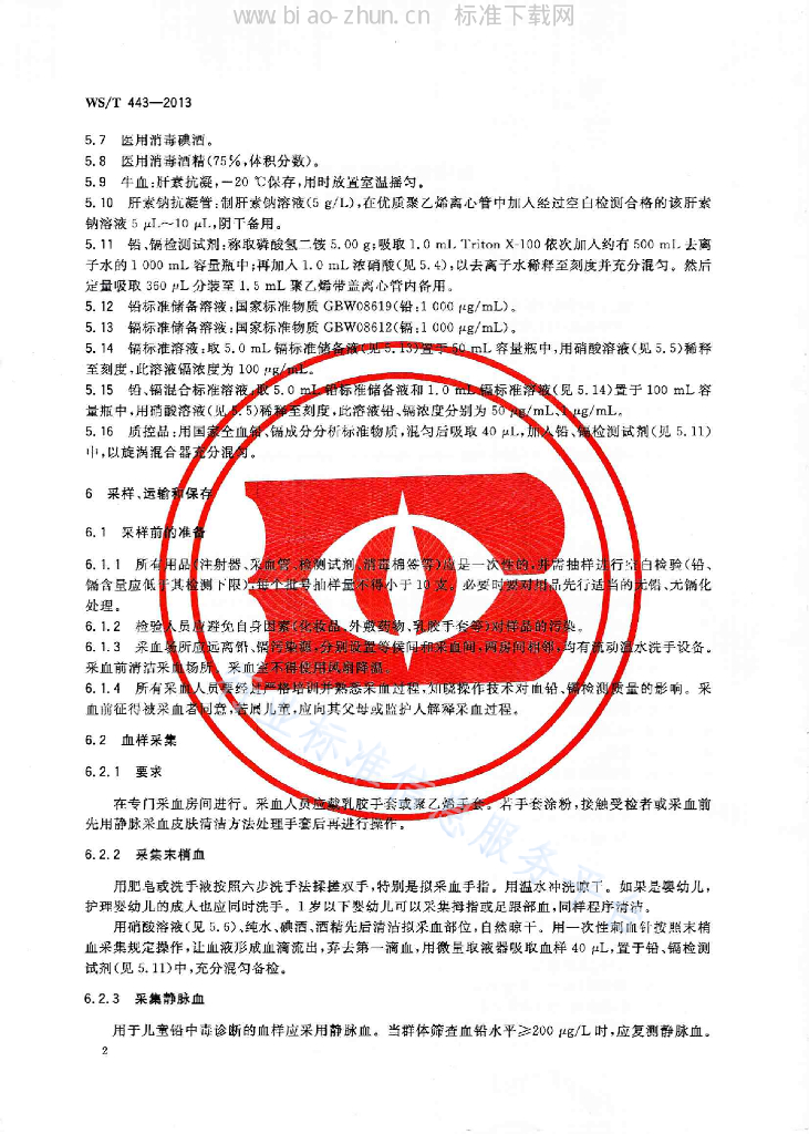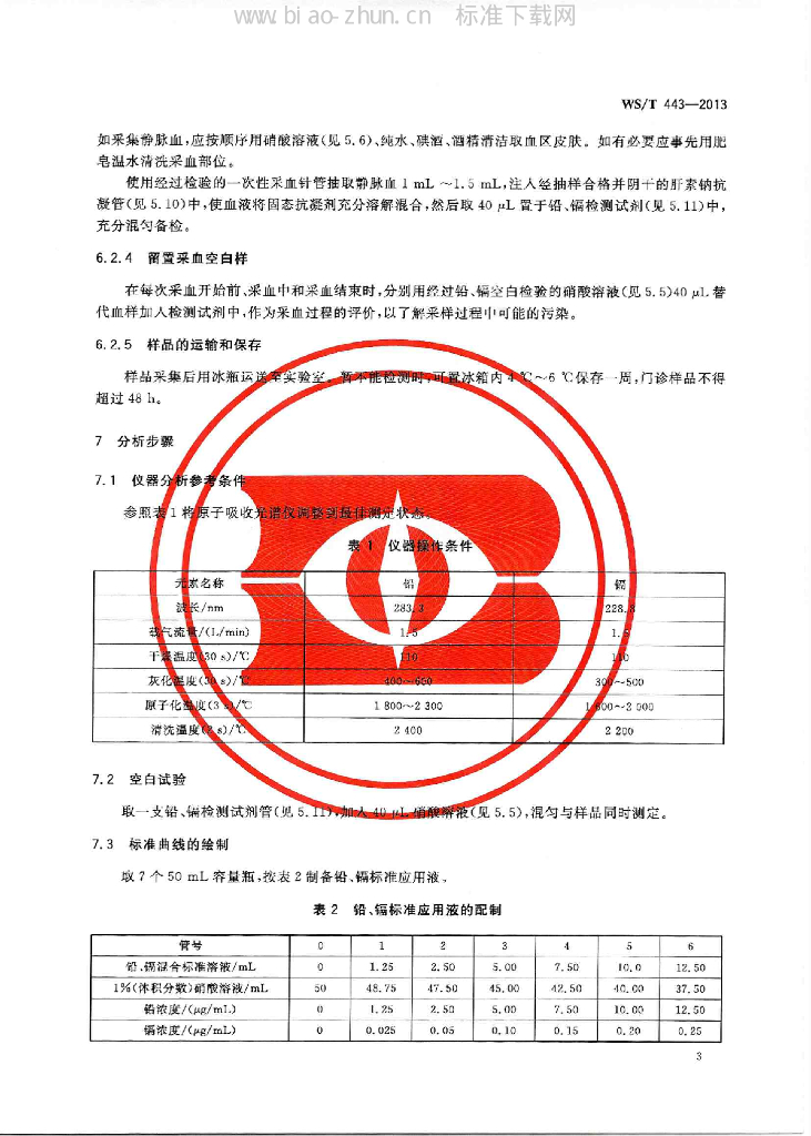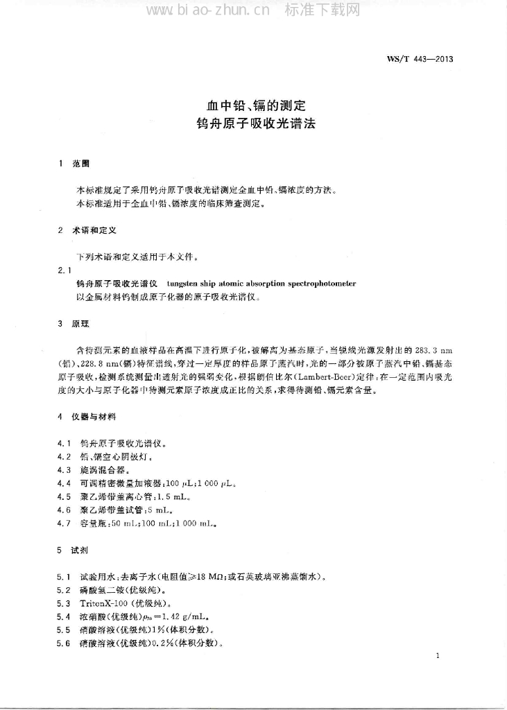WS/T 443-2013 血中铅、镉的测定 钨舟原子吸收光谱法