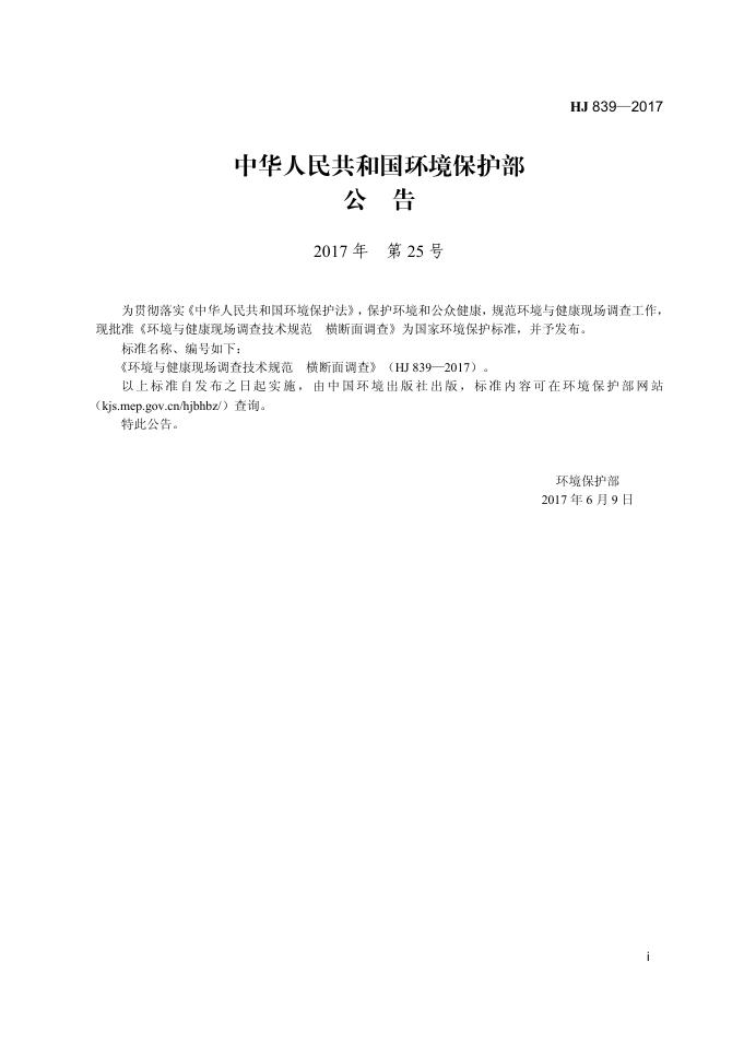 HJ 839-2017 环境与健康现场调查技术规范 横断面调查