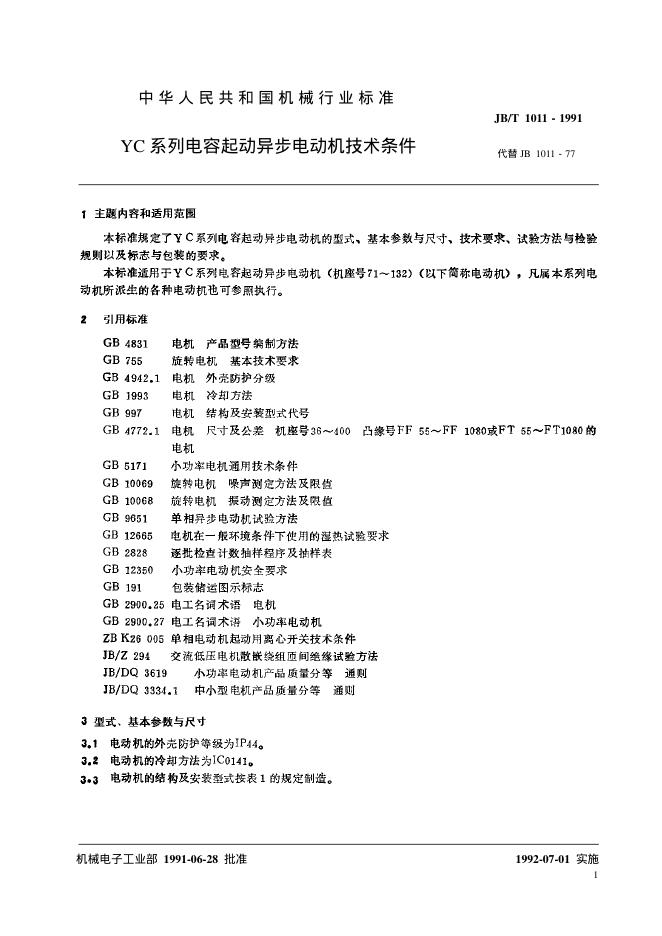 JB 1011-1991 YC系列电容起动异步电动机 技术条件