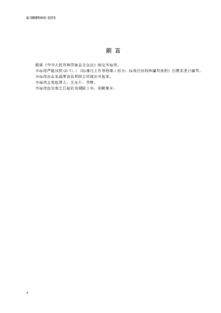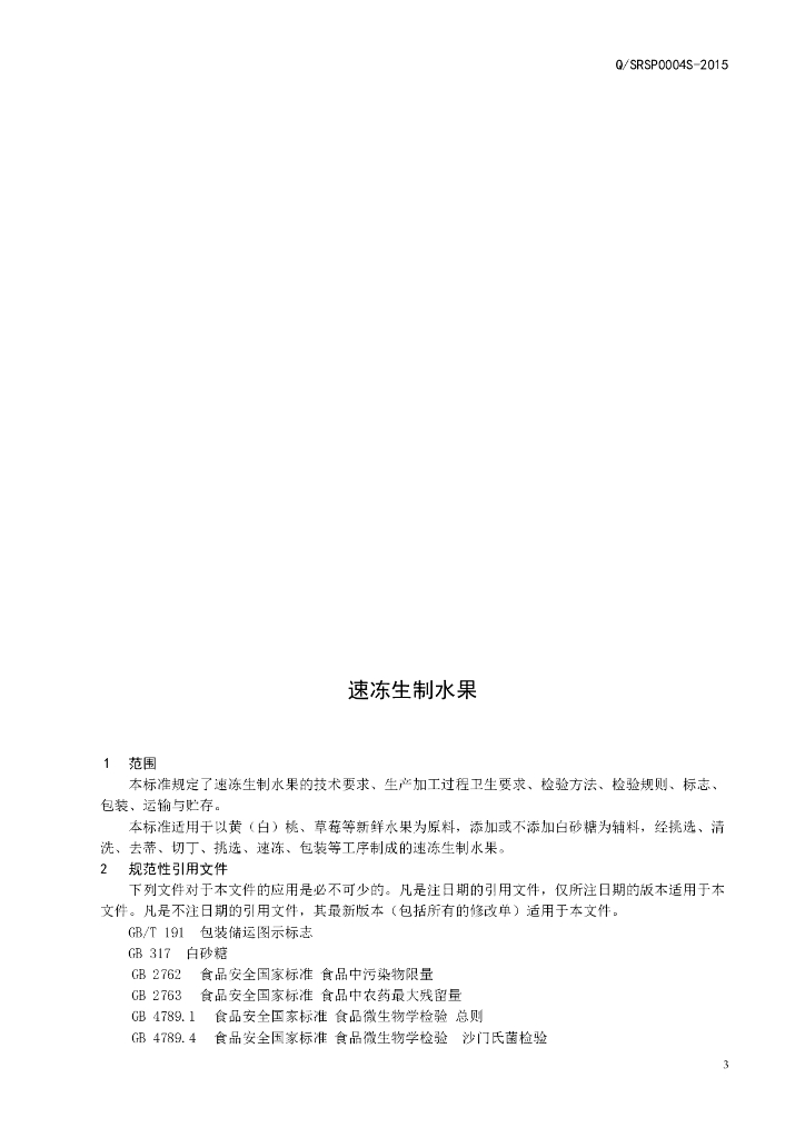 Q/SRSP 0004S-2015 山东晶荣食品有限公司 速冻生制水果