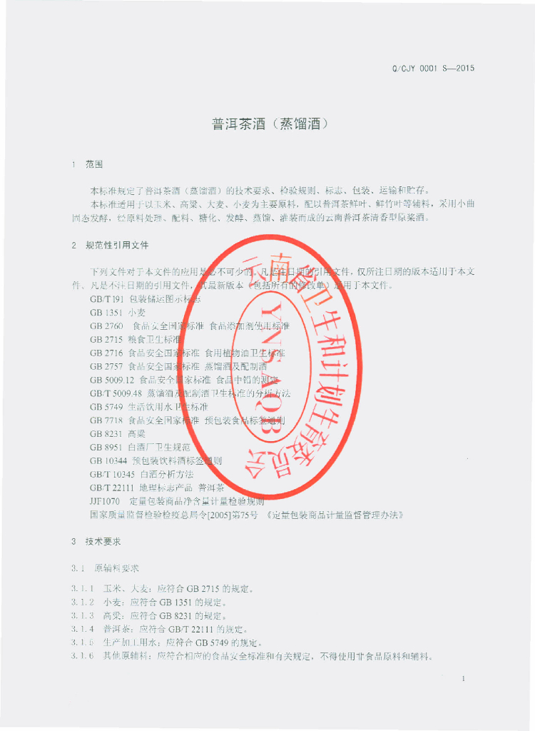 Q/CJY 0001S-2015 云南茶玖缘改名有限公司 普洱茶酒(蒸馏酒)