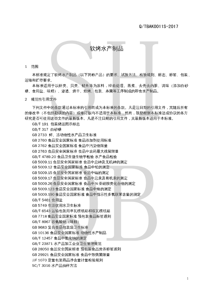 Q/TBAK 0011S-2017 软烤水产制品