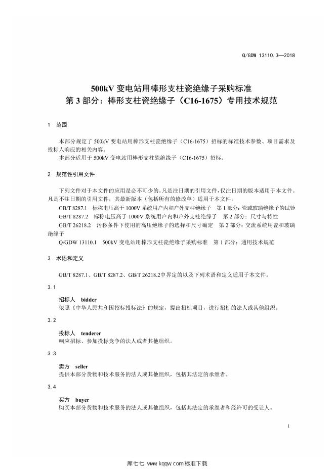 Q/GDW 13110.3-2018 500kV变电站用棒形支柱瓷绝缘子采购标准 第3部分:棒形支柱瓷绝缘子 C16-1675 专用技术规范