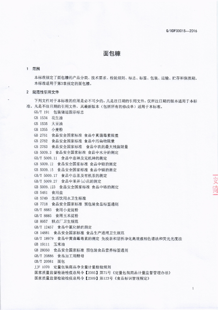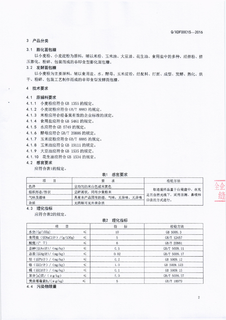 Q/XDF 0001S-2016 成都市鑫顶峰食品有限公司 面包糠
