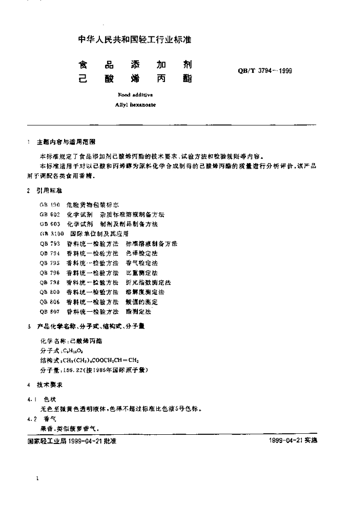 QB 3794-1999 食品添加剂 己酸烯丙酯