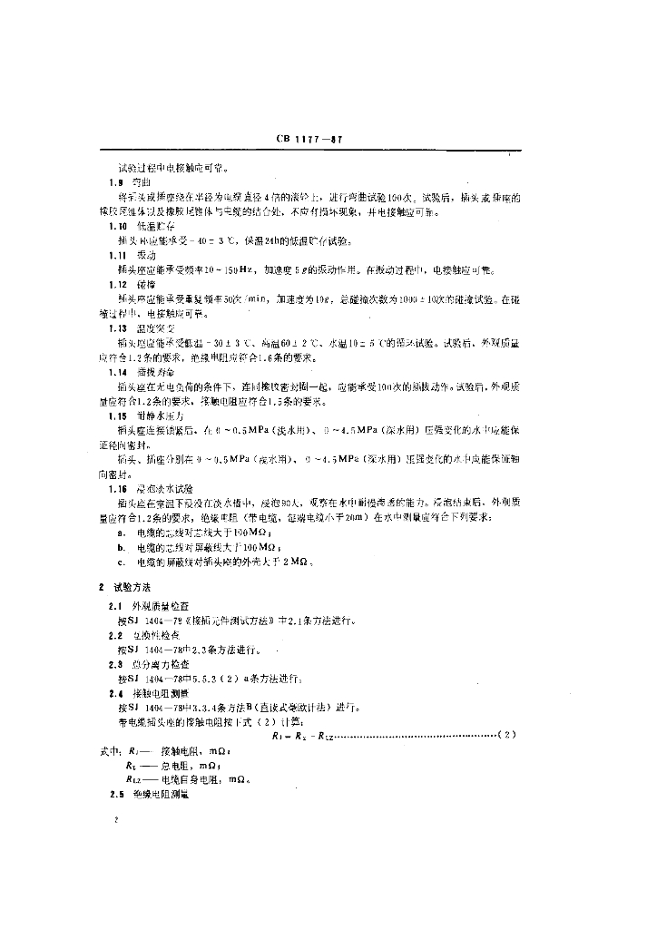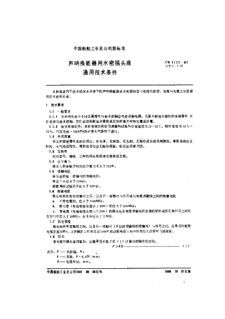 CB 1177-1987 声呐换能器用水密插头座通用技术条件