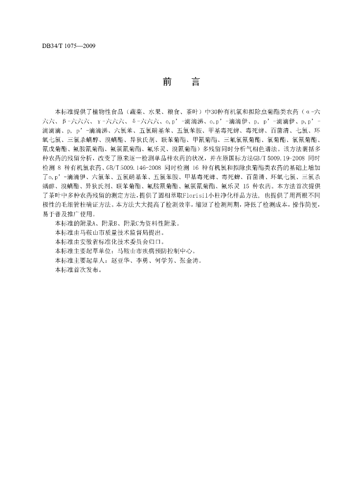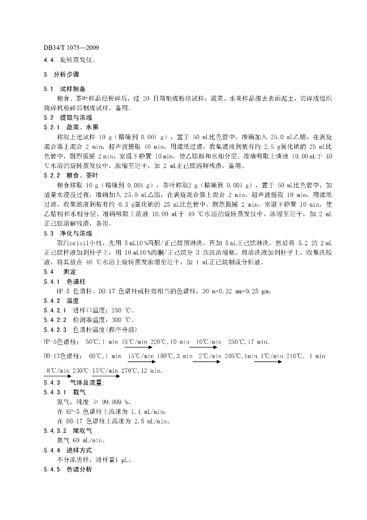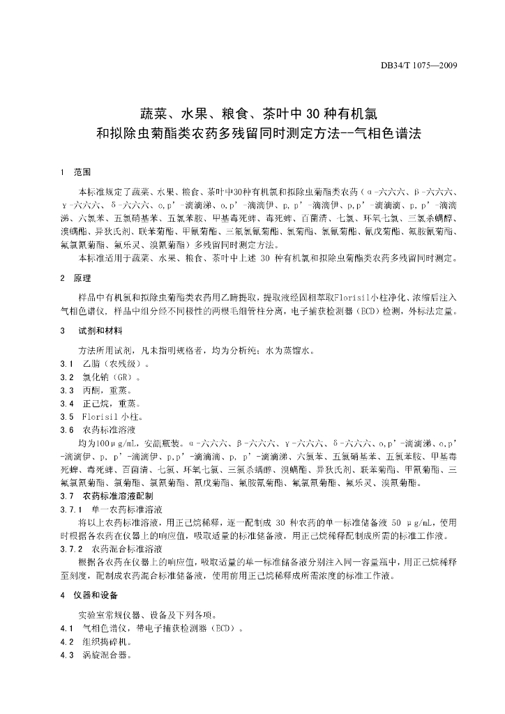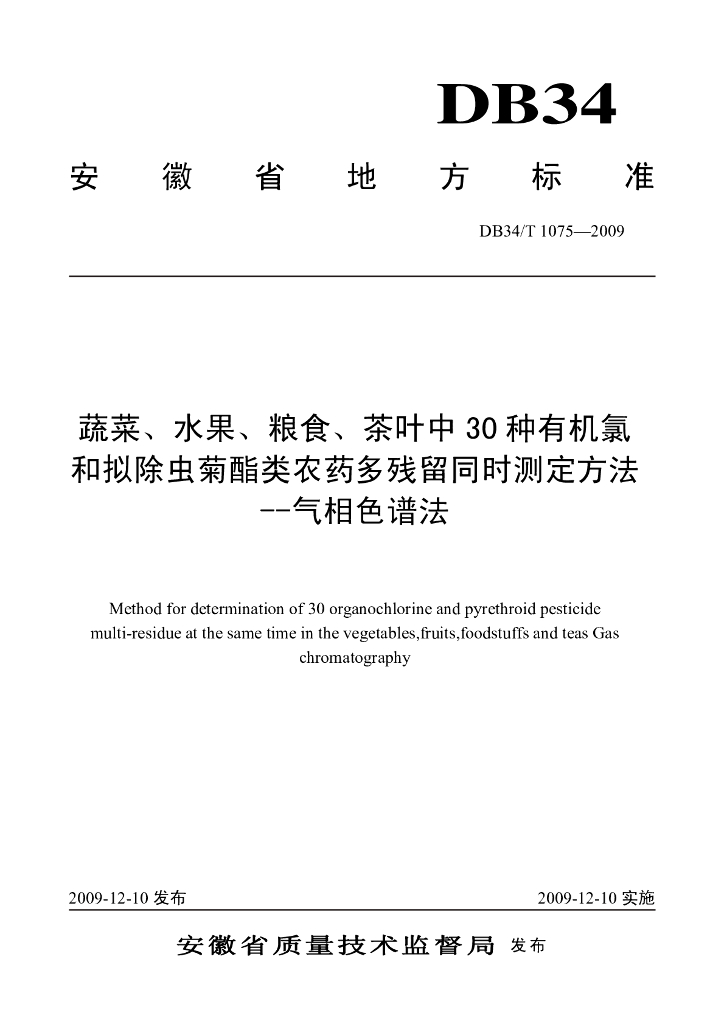 DB34/T 1075-2009 蔬菜、水果、粮食、茶叶中30种有机氯和拟除虫菊酯类农药多残留同时测定方法气相色谱法