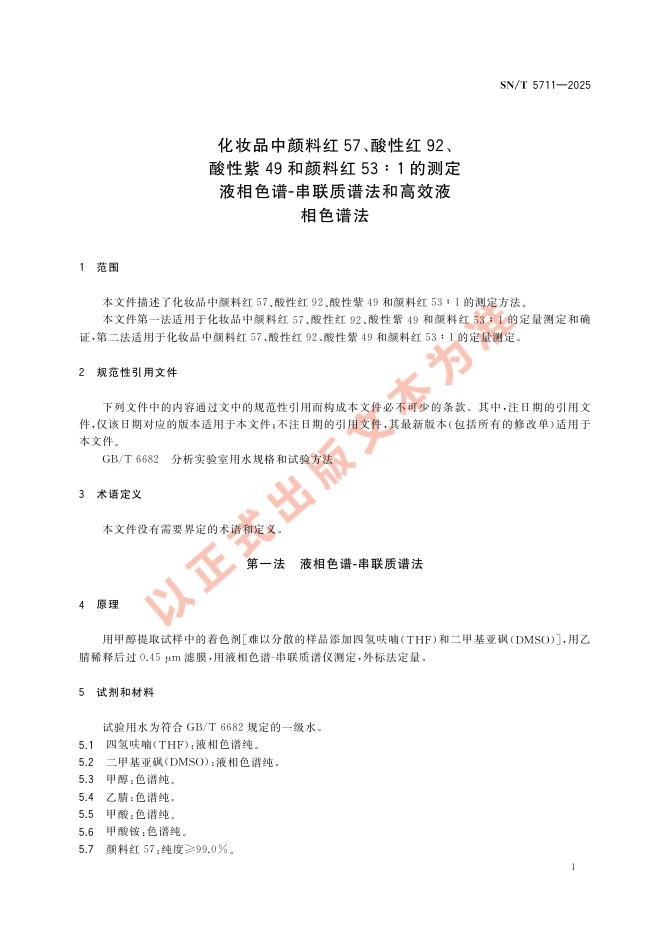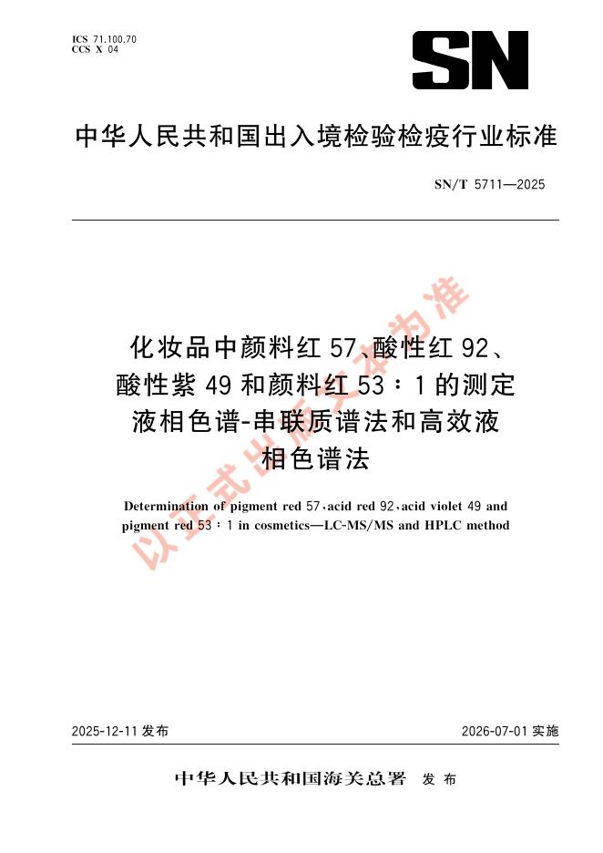 SN/T 5711-2025 化妆品中颜料红57、酸性红92、酸性紫49和颜料红53∶1的测定 液相色谱-串联质谱法和高效液相色谱法