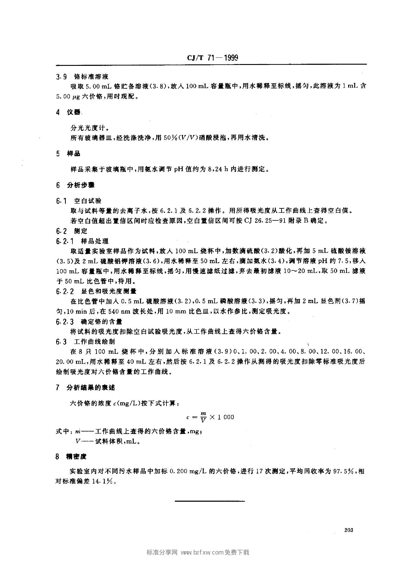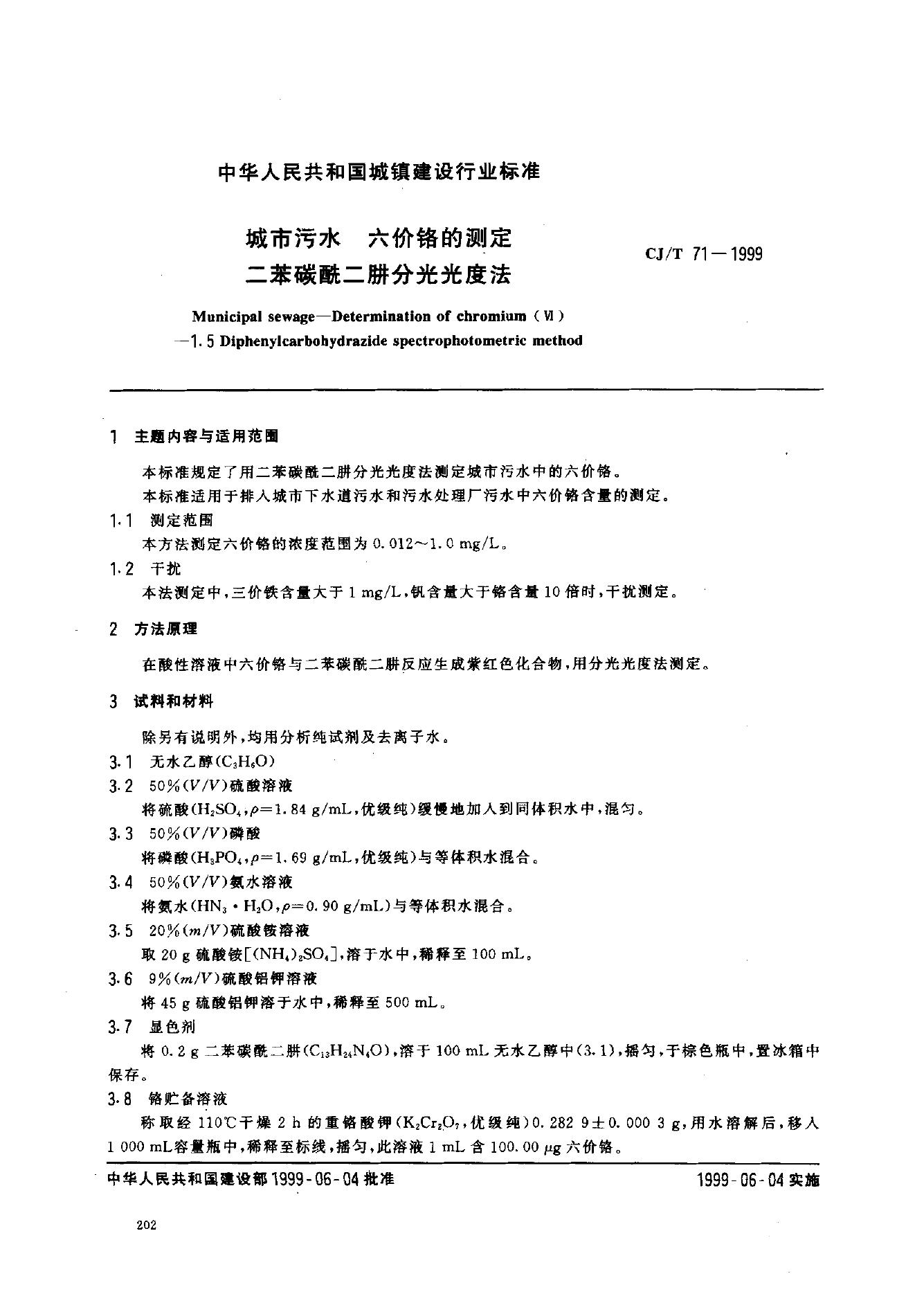 CJ/T 71-1999 城市污水 六价铬的测定 二苯碳酰二肼分光光度法