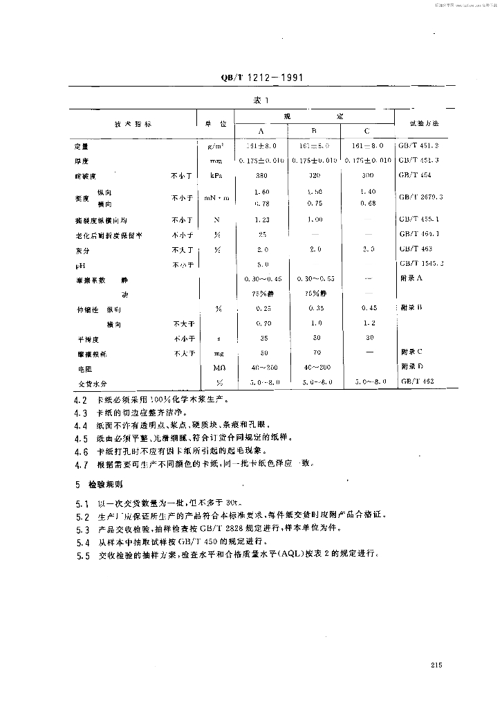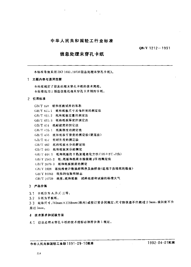 QB/T 1212-1991 信息处理未穿孔卡纸