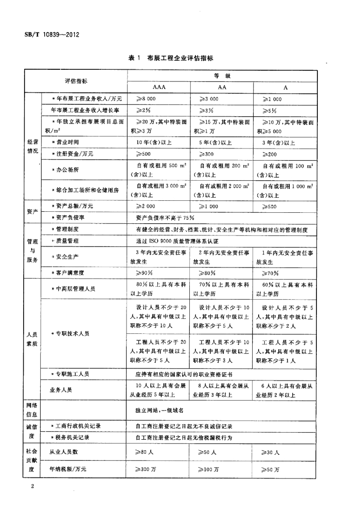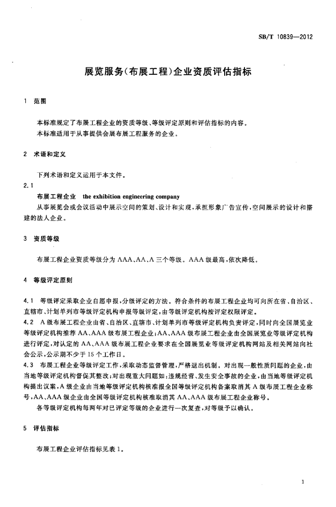 SB/T 10839-2012 展览服务(布展工程)企业资质评估指标