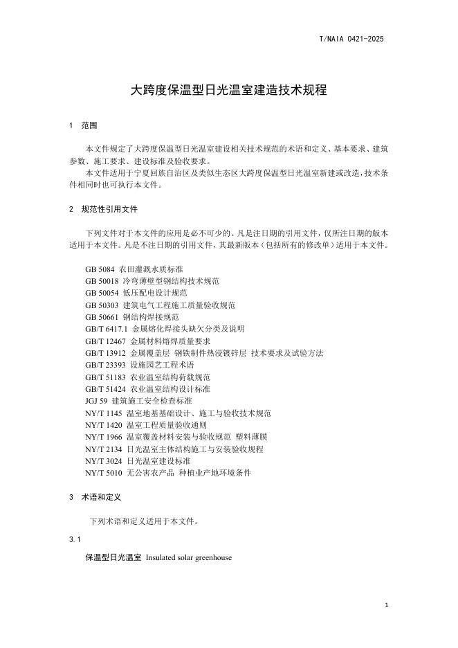 T/NAIA 0421-2025 大跨度保温型日光温室建造技术规程