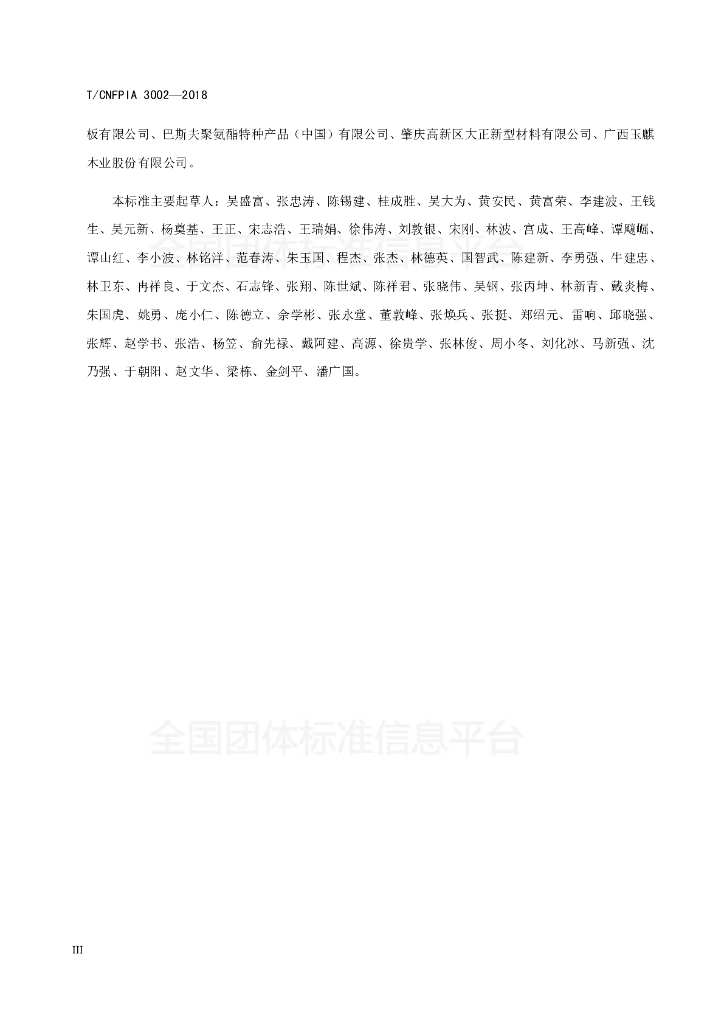 中国林产工业协会、北京绿奥诺技术服务有限公司、郑州佰沃生物质材料有限公司、宁波中科朝露新材料有限公司、上海亨斯迈聚氨酯有限公司、国家林业局林产工业规划设计院、中国林业科学研究院木材工业研究所、大亚人造板集团有限公司、烟台中品网络科技有限公司、广西丰林木业集团股份有限公司、山东安信木业有限公司、湖南粮食集团有限责任公司、广东汉鸿木业有限公司、广州也乐新材料科技有限公司、上海菲林格尔木业股份有限公司、湖北宝源木业有限公司、江苏艾科赛特新材料有限公司、东营人造板厂、巴洛克木业(中山)有限公司、寿光市鲁丽木业股份
