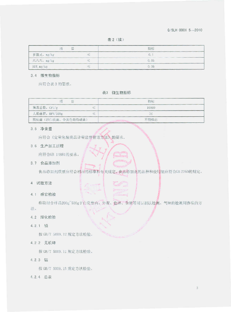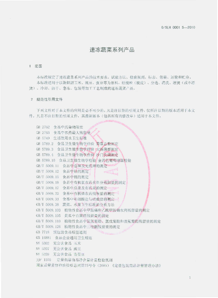 Q/SLH 0001S-2010 速冻蔬菜系列产品
