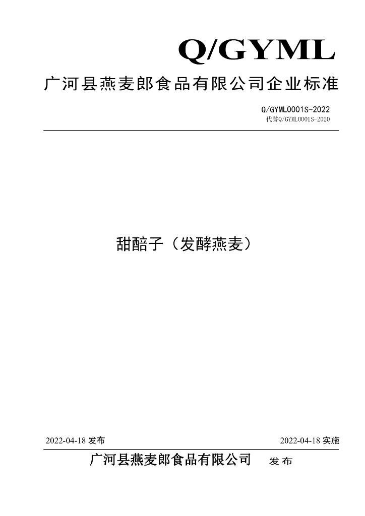Q/GYML 0001S-2022 甜醅子(发酵燕麦)