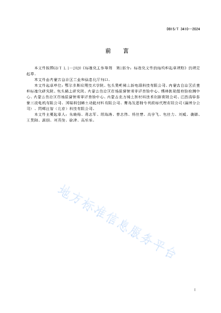 鄂尔多斯应用技术学院、包头昊明稀土新电源科技有限公司、内蒙古自治区质量和标准化研究院、包头稀土研究院、内蒙古自治区市场监督管理审评查验中心、锡林郭勒盟检验检测中心、内蒙古自治区市场监督管理审评查验中心、内蒙古北方稀土新材料技术创新有限公司、江西清华泰豪三波电机有限公司、国瑞科创稀土功能材料有限公司、青岛发思特专利商标代理有限公司(淄博分公司)、同辉注智(北京)科技有限公司