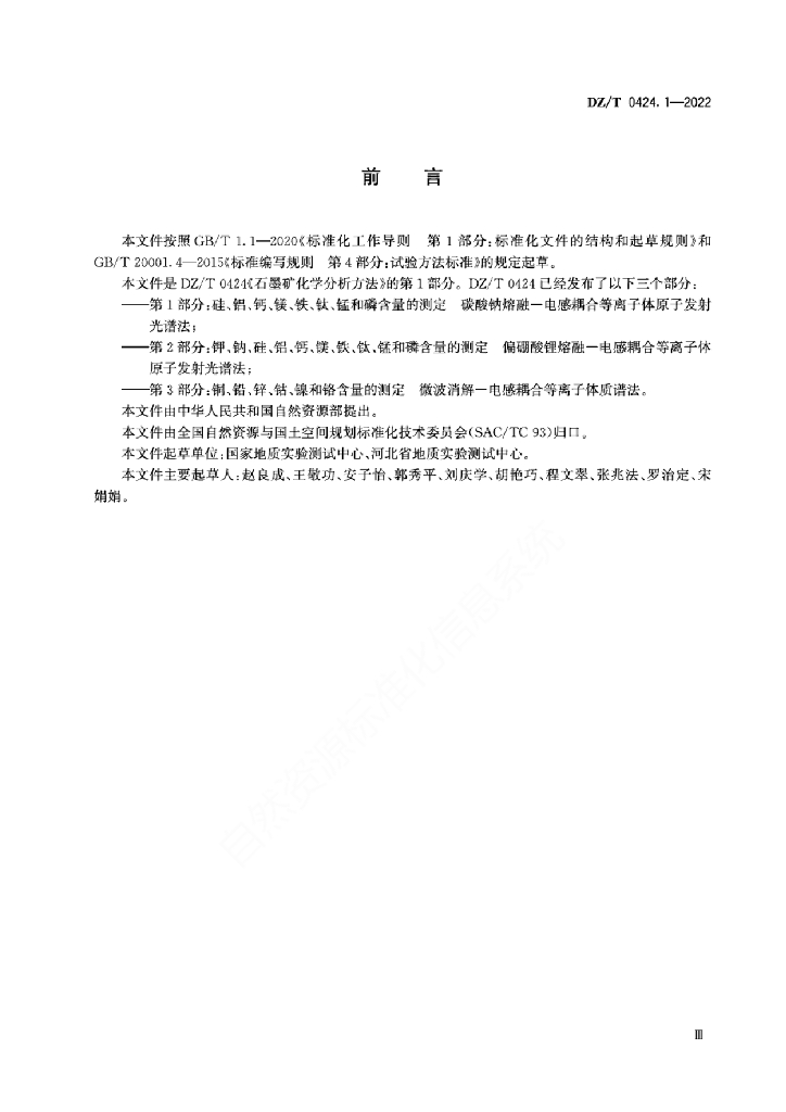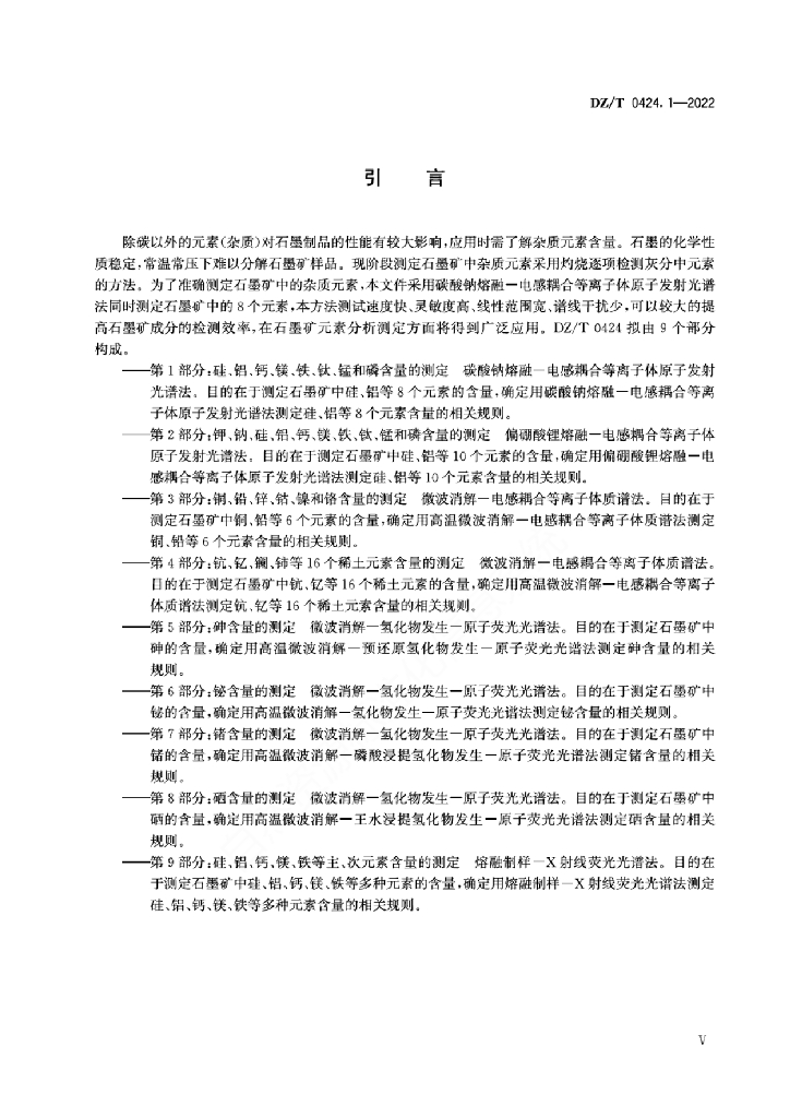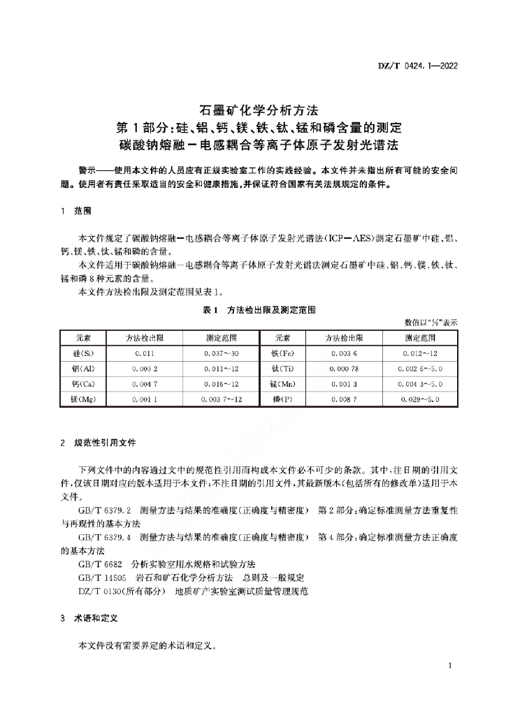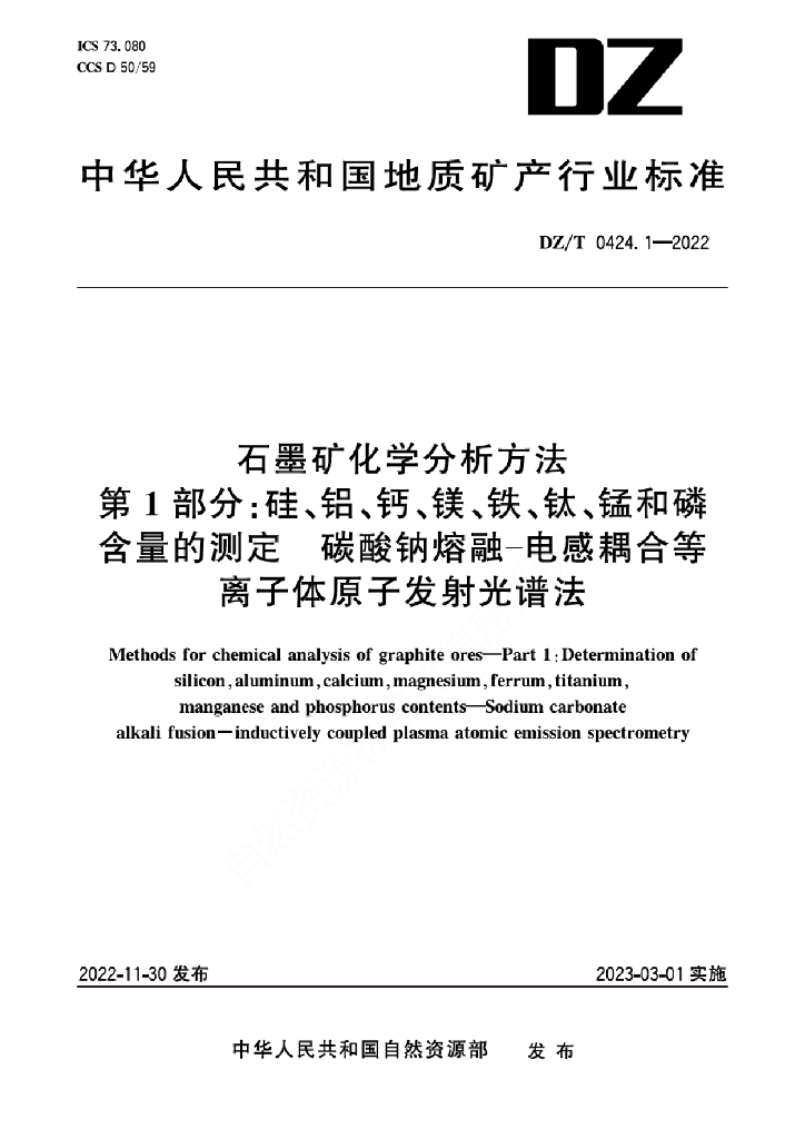 DZ/T 0424.1-2022 石墨矿化学分析方法 第1部分:硅、铝、钙、镁、铁、钛、锰和磷含量的测定 碳酸钠熔融-电感耦合等离子体原子发射光谱法