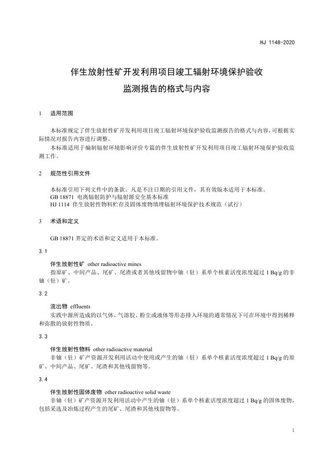 HJ 1148-2020 伴生放射性矿开发利用项目竣工辐射环境保护验收监测报告的格式与内容