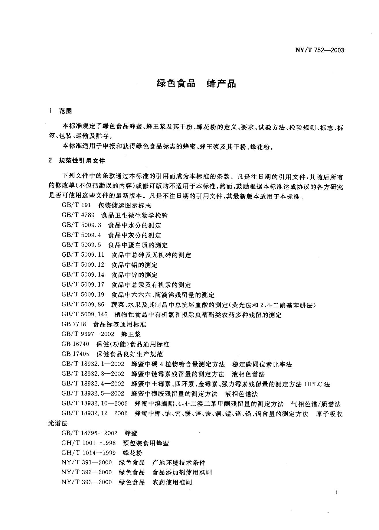 NY/T 752-2003 绿色食品 蜂产品