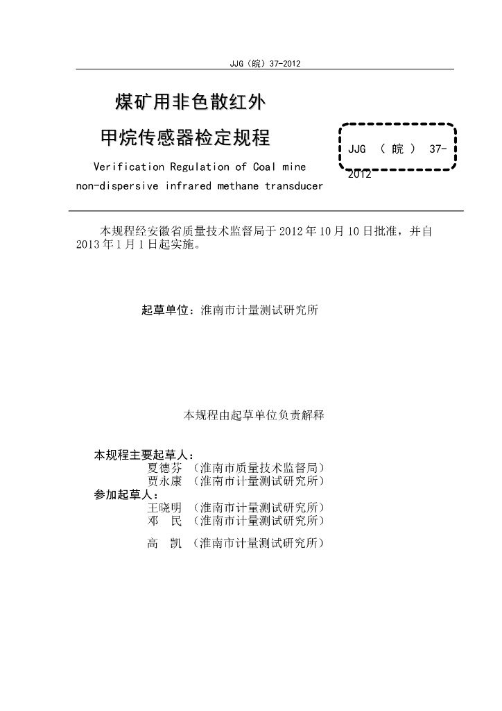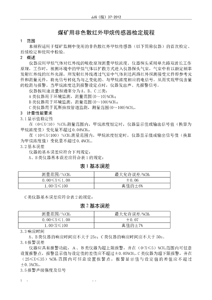 JJG(皖)37-2012 红外非色散甲烷传感器检定规程
