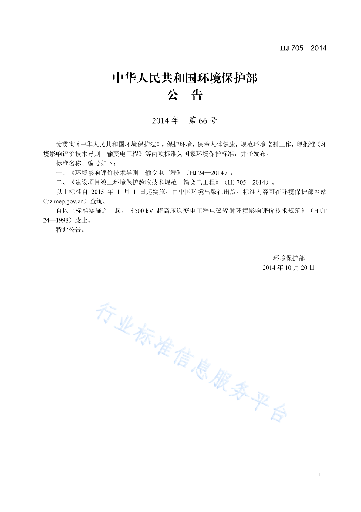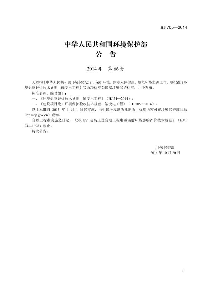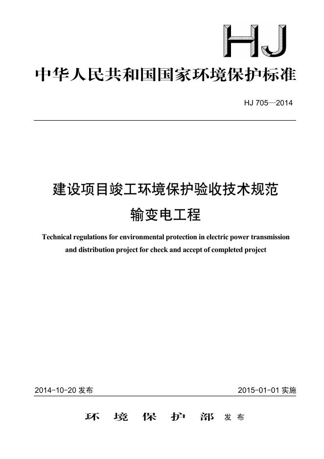 HJ 705-2014 建设项目竣工环境保护验收技术规范 输变电工程