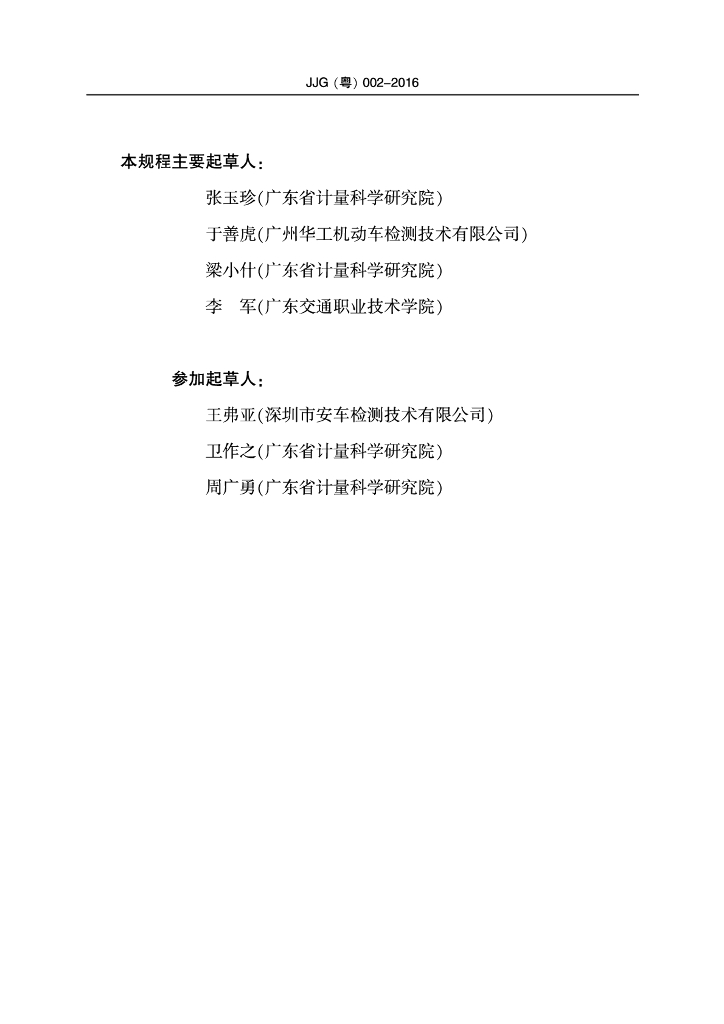 张玉珍(广东省计量科学研究院)、于善虎(广州华工机动车检测技术有限公司)、梁小什(广东省计量科学研究院)、李军(广东交通职业技术学院)、王弗亚(深圳市安车检测技术有限公司)、卫作之(广东省计量科学研究院)、周广勇(广东省计量科学研究院)