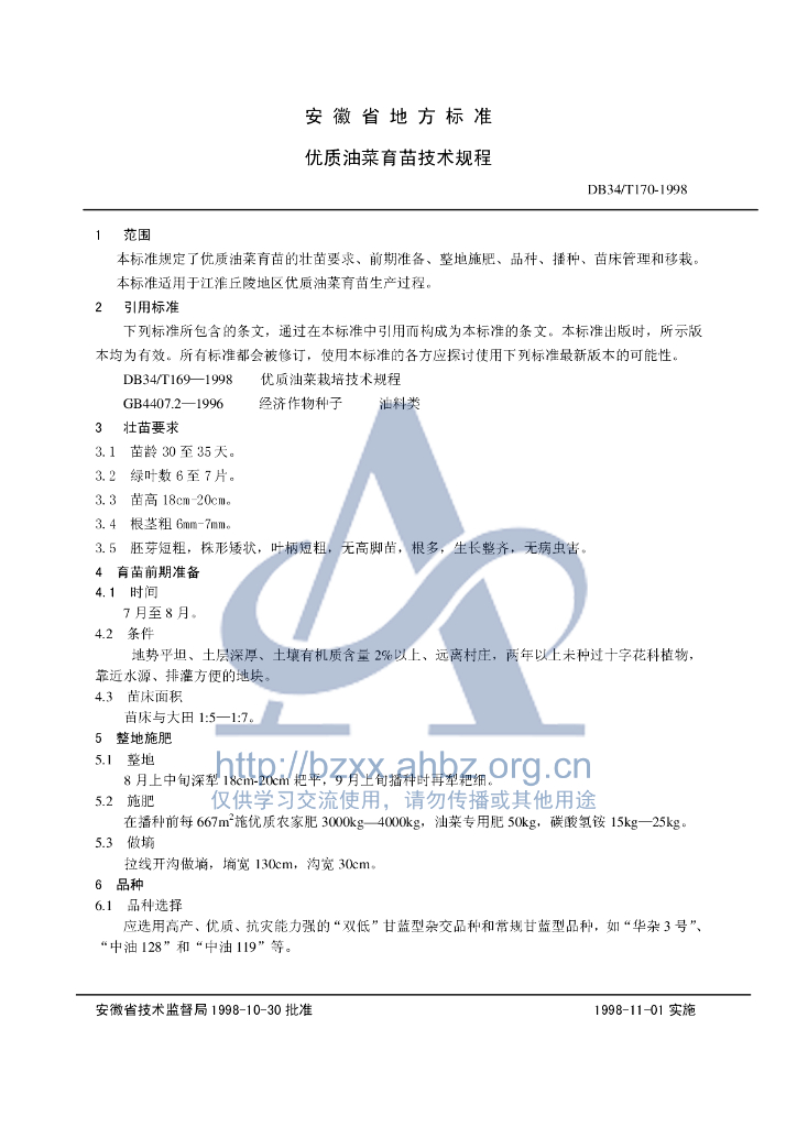 DB34/T 170-1998 优质油菜育苗技术规程