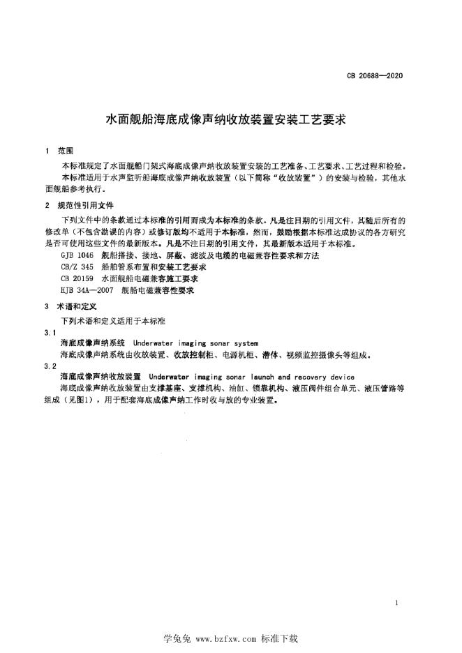 CB 20688-2020 水面舰船海底成像声纳收放装置安装工艺要求